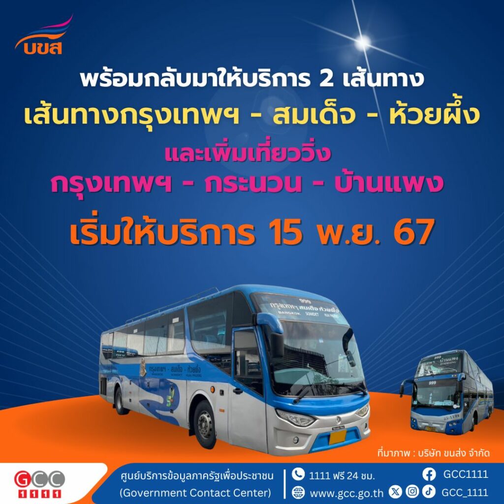 บริษัท ขนส่ง จำกัด กลับมาเปิดให้บริการเดินรถโดยสาร สายที่ 30 เส้นทางกรุงเทพฯ – สมเด็จ – ห้วยผึ้ง ระยะทาง 572 กิโลเมตร และเตรียมเพิ่มเที่ยววิ่ง สายที่ 33 เส้นทางกรุงเทพฯ – กระนวน – บ้านแพง ระยะทาง 784 กิโลเมตร เริ่มให้บริการ วันที่ 15 พฤศจิกายน 2567 เพื่ออำนวยความสะดวกผู้โดยสารเข้าถึงบริการทุกพื้นที่ และรองรับการเดินทางในช่วงฤดูกาลท่องเที่ยว