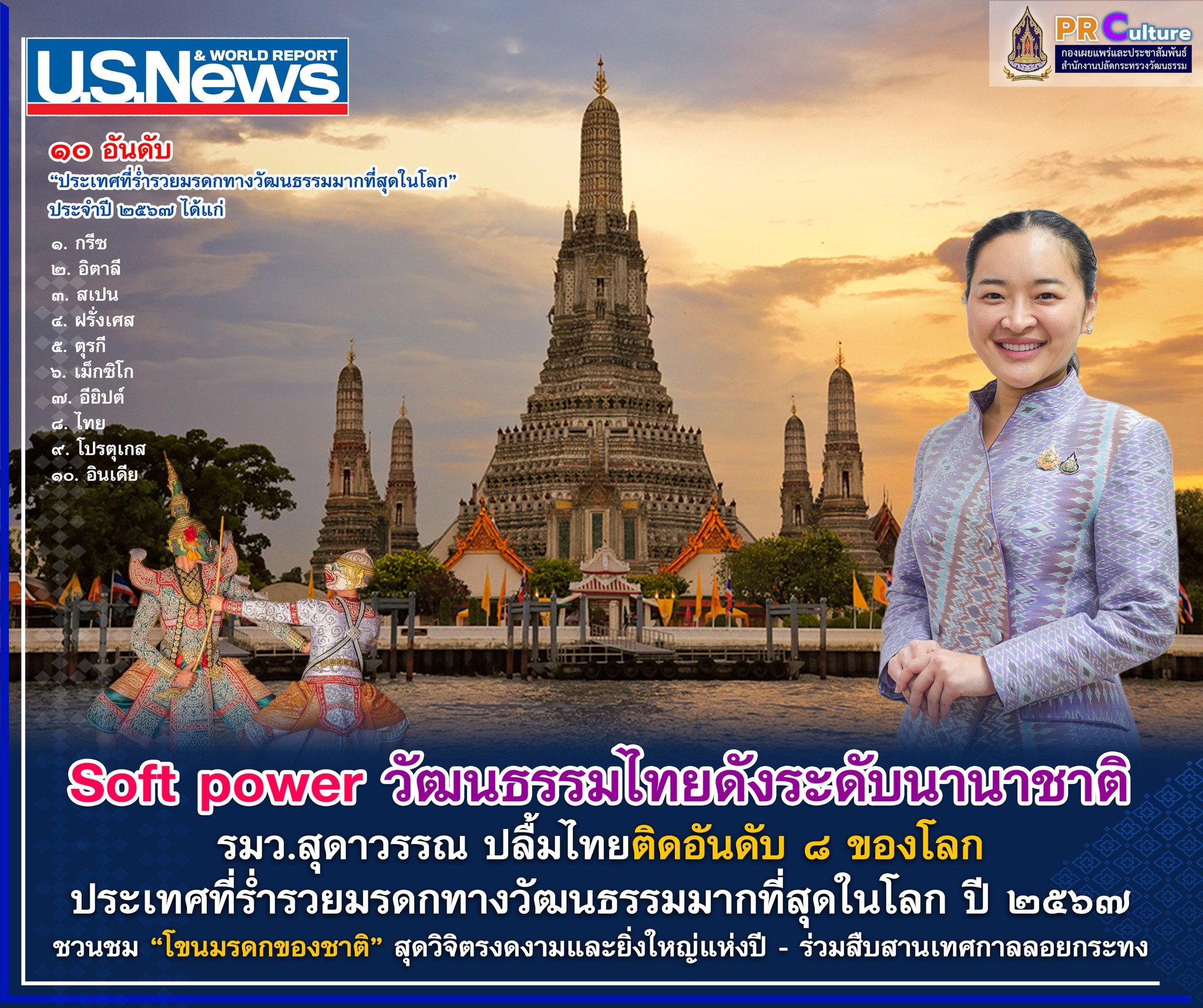 Soft Power วัฒนธรรมไทยดังระดับนานาชาติ รมว.สุดาวรรณ เผยข่าวดีไทยติดอันดับ 8 ของโลก ประเทศที่ร่ำรวยมรดกทางวัฒนธรรมมากที่สุดในโลก ปี 2567 เชิญชวนชม “โขนมรดกของชาติ” สุดวิจิตรงดงามและยิ่งใหญ่แห่งปี – ร่วมสืบสานเทศกาลลอยกระทง เดินหน้ายกระดับเทศกาลประเพณี – มรดกภูมิปัญญาไทยสู่มรดกของโลก เพื่อขับเคลื่อน Soft Power สร้างเสน่ห์วิถีไทยดึงดูดนักท่องเที่ยว