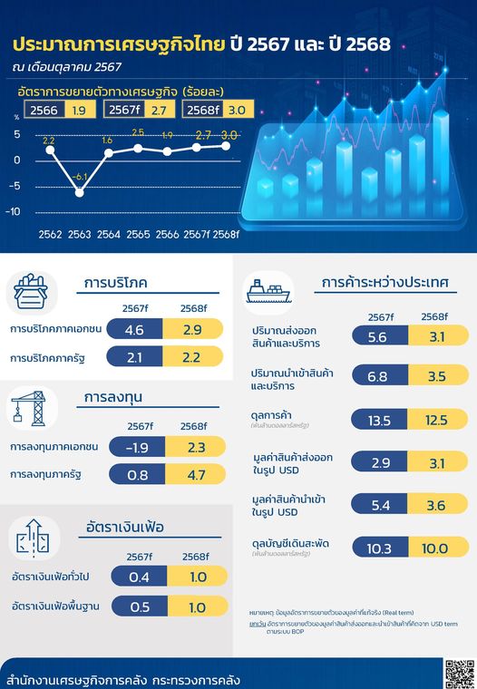 “เศรษฐกิจไทยปี 2567 คาดว่าจะขยายตัวที่ร้อยละ 2.7 นำโดยการฟื้นตัวของภาคการท่องเที่ยว และภาคการส่งออกสินค้า และมาตรการกระตุ้นเศรษฐกิจในช่วงปลายปี ขณะที่เศรษฐกิจไทยปี 2568 คาดว่าจะขยายตัวเร่งขึ้นมาอยู่ที่ร้อยละ 3.0 ต่อปี จากปัจจัยบวก 4 ด้านหลักคือการบริโภคภาคเอกชน การส่งออกสินค้า การท่องเที่ยว และการลงทุนทั้งภาครัฐและเอกชน ทั้งนี้ กระทรวงการคลังต้องติดตามสถานการณ์เศรษฐกิจทั้งภายในและภายนอกอย่างใกล้ชิด”
