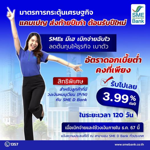 ธนาคารพัฒนาวิสาหกิจขนาดกลางและขนาดย่อมแห่งประเทศไทย ออกแคมเปญของขวัญส่งท้ายปี “SMEs มีเฮ เบิกจ่ายฉับไว ลดต้นทุนให้ธุรกิจ เบาตัว” สนับสนุนให้ลูกค้าเดิมที่มีวงเงินหมุนเวียน (Promissory Note – P/N) กับธนาคาร สามารถเบิกจ่ายเงินอย่างเร่งด่วน นำไปใช้หมุนเวียนเสริมสภาพคล่อง ด้วยต้นทุนการเงินต่ำ อัตราดอกเบี้ยพิเศษเพียง 3.99% ต่อปี เป็นเวลานานถึง 120 วัน ช่วยให้ลดภาระทางการเงิน และมีทุนนำไปใช้หมุนเวียนเสริมสภาพคล่องขับเคลื่อนธุรกิจได้ต่อเนื่อง แจ้งความประสงค์และเบิกจ่ายใช้เงินได้ ตั้งแต่บัดนี้จนถึงสิ้นปี 2567 เท่านั้น ณ สาขาของ SME D Bank ที่ใช้บริการอยู่ สอบถามข้อมูลเพิ่มเติม Call Center 1357