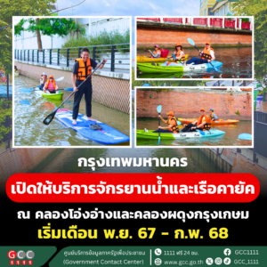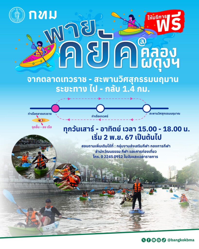 กรุงเทพมหานคร ให้บริการจักรยานน้ำและเรือคายัค ในวันเสาร์และวันอาทิตย์ เริ่มเดือน พฤศจิกายน 2567 ถึงเดือนกุมภาพันธ์ 2568