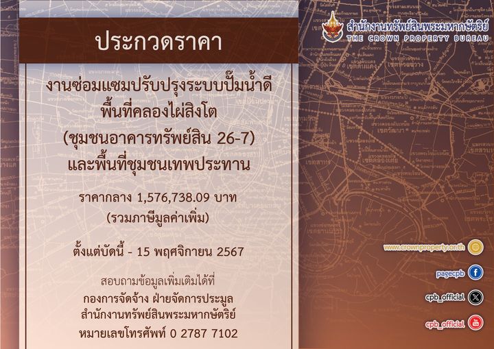 สำนักงานทรัพย์สินพระมหากษัตริย์ เปิดประกวดราคางานซ่อมแซมปรับปรุงระบบปั๊มน้ำดี พื้นที่คลองไผ่สิงโต ฯ