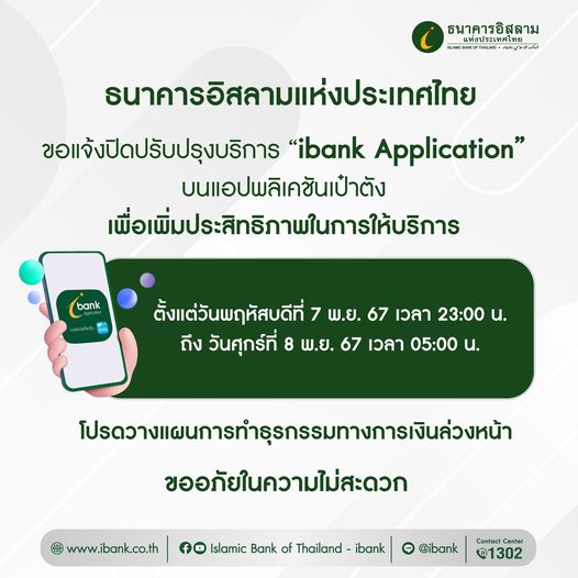 ธนาคารอิสลามแห่งประเทศไทย แจ้งปิดปรับปรุงบริการ “ibank Application” บนแอปพลิเคชันเป๋าตัง ตั้งแต่วันที่ 7 พฤศจิกายน 2567 เวลา 23.00 น. ถึง วันที่ 8 พฤศจิกายน 2567 เวลา 05.00 น. เพื่อเพิ่มประสิทธิภาพในการให้บริการ