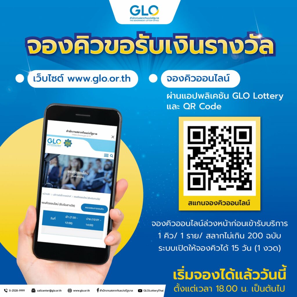 สำนักงานสลากกินแบ่งรัฐบาล เปิดให้จองคิวขอรับเงินรางวัลสลากกินแบ่งรัฐบาล เวลา 18.00 น. ข่าวสารกิจกรรม สำนักงานสลากกินแบ่งรัฐบาล เปิดให้จองคิวขอรับเงินรางวัลสลากกินแบ่งรัฐบาล เวลา 18.00 น. สำนักงานสลากกินแบ่งรัฐบาล เปิดให้จองคิวขอรับเงินรางวัลสลากกินแบ่งรัฐบาล ตั้งแต่ เวลา 18.00 น. เป็นต้นไปโดยสามารถจองคิวได้ผ่านทางเว็บไซต์ www.glo.or.thจองคิวออนไลน์ผ่านแอปพลิเคชัน GLO Lotteryสแกน ผ่าน QR Code ในภาพด้านล่างจองคิวได้ตั้งแต่เวลา 18.00 น. เป็นต้นไปสอบถามรายละเอียดเพิ่มเติมได้ที่โทร.0 2528 9732 และ 0 2528 9742 (ในวัน-เวลาทำการ) หรือ Call center โทร. 0 2528 9999ที่มา : https://bit.ly/4fuuuUV Post Views: 9 FacebookFacebookXTwitterLINELine