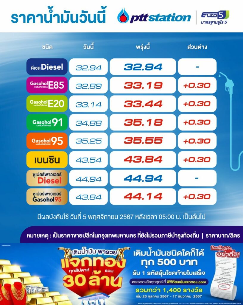 ปตท. ปรับขึ้นราคาน้ำมันในกลุ่มเบนซิน ส่วนน้ำมันในกลุ่มดีเซลราคาคงเดิม มีผลวันที่ 5 พ.ย. 67