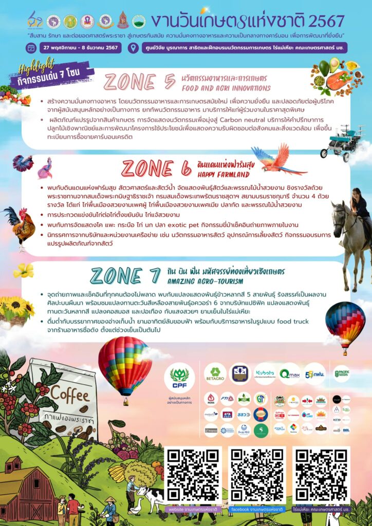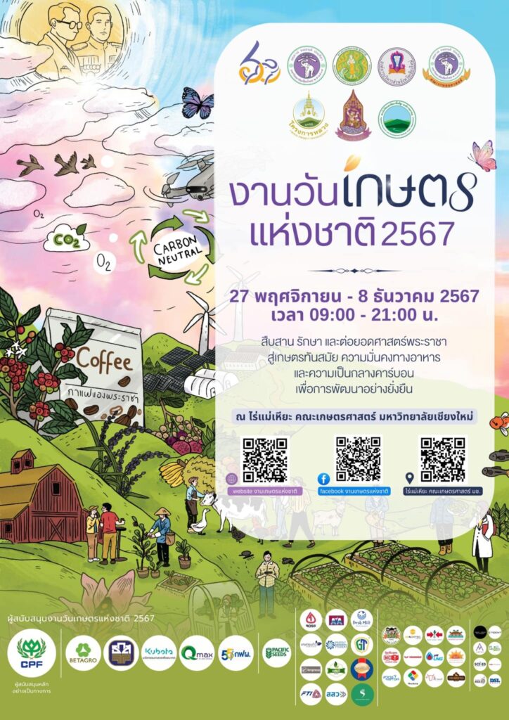 กระทรวงเกษตรและสหกรณ์ ร่วมกับคณะเกษตรศาสตร์ มหาวิทยาลัยเชียงใหม่ จัดงานวันเกษตรแห่งชาติ ประจำปี 2567 ระหว่างวันที่ 27 พฤศจิกายน – 8 ธันวาคม 2567 ณ ไร่แม่เหียะ ศูนย์วิจัย บูรณาการ สาธิตและฝึกอบรมนวัตกรรมการเกษตร คณะเกษตรศาสตร์ มหาวิทยาลัยเชียงใหม่