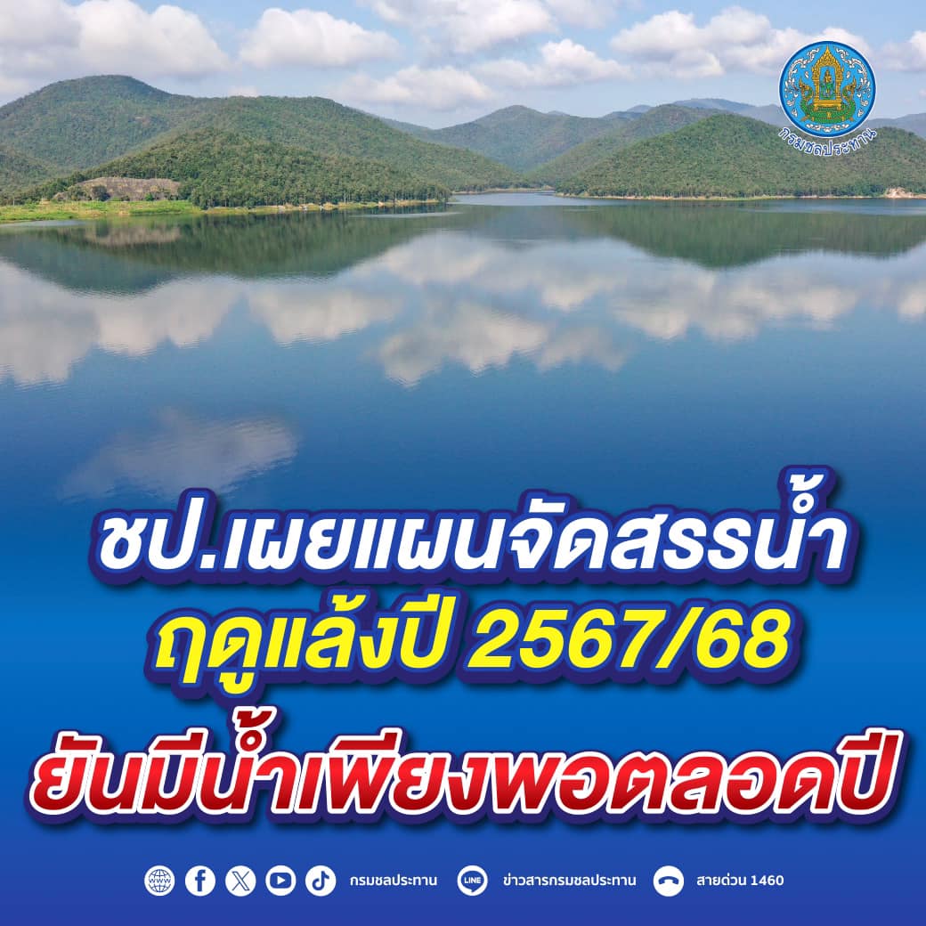 กรมชลประทาน วางแผนจัดสรรน้ำฤดูแล้งปี 2567/68 (ระหว่างเดือนพฤศจิกายน 2567 – 30 เมษายน 2568) ตามปริมาณน้ำต้นทุน เพื่อสนับสนุนการใช้น้ำในทุกกิจกรรมตามลำดับความสำคัญ โดยแบ่งเป็นน้ำเพื่ออุปโภคบริโภค รักษาระบบนิเวศ การเกษตร อุตสาหกรรม และอื่นๆ รวมทั้งประเทศประมาณ 29,170 ล้านลูกบาศก์เมตร รวมทั้งสำรองไว้ใช้ต้นฤดูฝนหน้า (พฤษภาคม – สิงหาคม 2568) อีกประมาณ 15,080 ล้านลูกบาศก์เมตร ซึ่งเพียงพอตามแผนที่กำหนดไว้