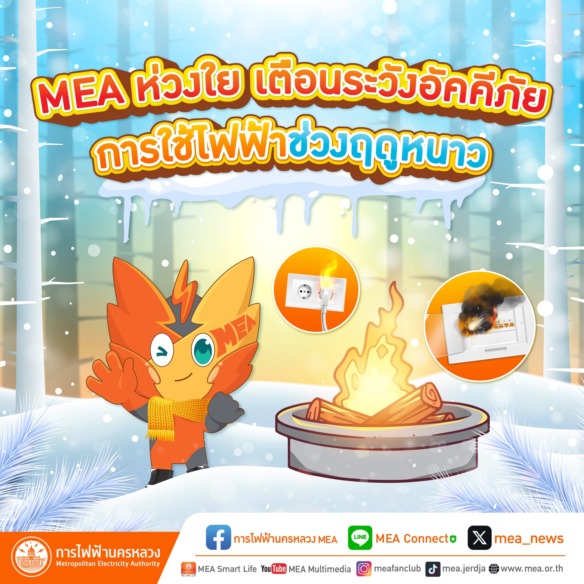 MEA มีความห่วงใยประชาชน ตามประกาศกรมอุตุนิยมวิทยา ประเทศไทยได้เข้าสู่ฤดูหนาว ตั้งแต่วันที่ 29 ตุลาคม เป็นต้นไป ขอให้ประชาชนดูแลสุขภาพเนื่องจากอากาศที่เย็นลง และเตือนให้ระมัดระวังการใช้ไฟฟ้าในช่วงฤดูหนาว เนื่องจากสภาพอากาศที่แห้งและความชื้นต่ำ อาจทำให้อุปกรณ์ไฟฟ้าที่ชำรุดหรือไม่มีคุณภาพ เกิดไฟฟ้าลัดวงจรและนำไปสู่อัคคีภัยได้