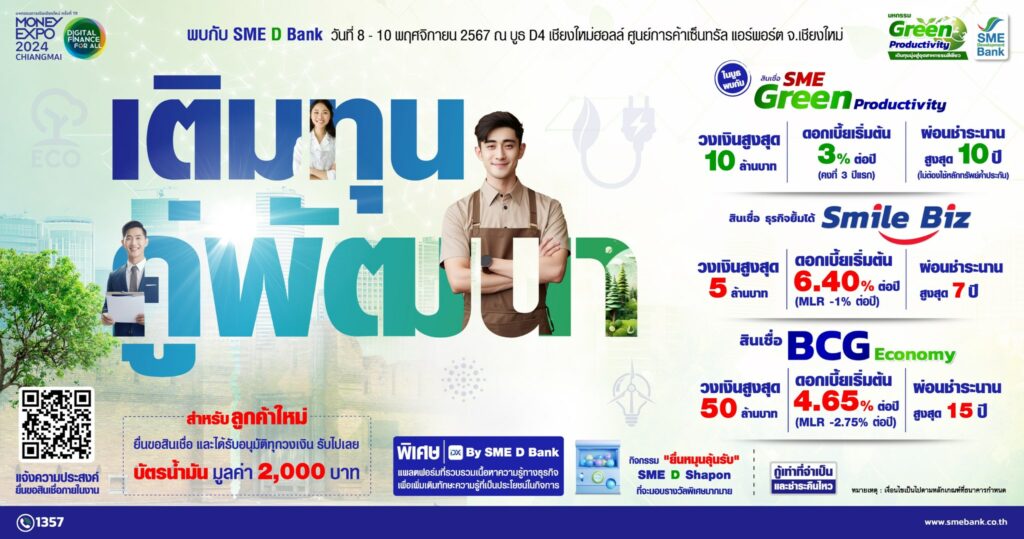 ธนาคารพัฒนาวิสาหกิจขนาดกลางและขนาดย่อมแห่งประเทศไทย (ธพว.) หรือ SME D Bank ร่วมออกบูธให้บริการเติมทุนคู่พัฒนาแก่ผู้ประกอบการเอสเอ็มอีภาคเหนือ ในงาน มหกรรมการเงิน เชียงใหม่ ครั้งที่ 19 (MONEY EXPO 2024 CHIANGMAI) ระหว่างวันที่ 8-10 พฤศจิกายน 2567 ณ บูธ D4 เชียงใหม่ฮอลล์ ศูนย์การค้าเซ็นทรัล แอร์พอร์ต จ.เชียงใหม่ ยกทัพบริการด้วยผลิตภัณฑ์สินเชื่อดอกเบี้ยต่ำครอบคลุมทุกกลุ่มธุรกิจ เช่น สินเชื่อ “SME Green Productivity” เงื่อนไขพิเศษดอกเบี้ยเพียง 3% คงที่ตลอด 3 ปีแรก วงเงินกู้สูงสุด 10 ล้านบาท ผ่อนชำระนานสูงสุด 10 ปี มีหรือไม่มีหลักทรัพย์ค้ำประกัน ก็กู้ได้ และสินเชื่อ “Smile Biz ธุรกิจยิ้มได้” ดอกเบี้ยเริ่มต้น 6.40% ต่อปี วงเงินกู้สูงสุด 5 ล้านบาท ทำธุรกิจ 1 ปี ก็กู้ได้ ควบคู่บริการช่วยพัฒนาครบวงจร ฟรี ผ่านแพลตฟอร์มอัจฉริยะ “DX by SME D Bank” (dx.smebank.co.th)