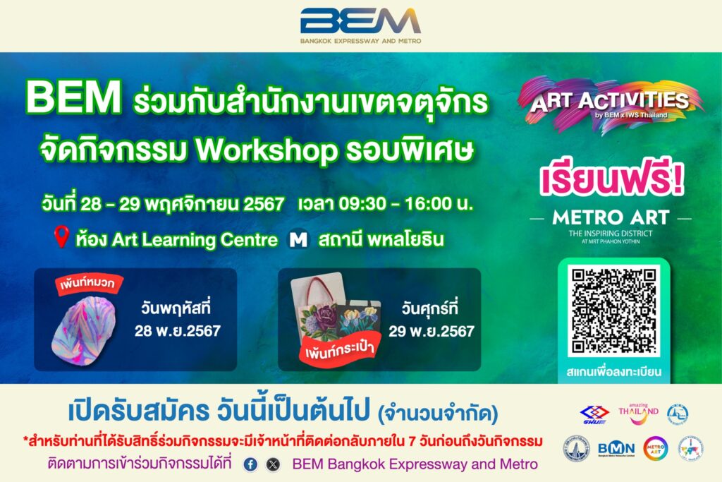 บริษัท ทางด่วนและรถไฟฟ้ากรุงเทพ จำกัด (มหาชน) ร่วมกับ สำนักงานเขตจตุจักร จัด Workshop รอบพิเศษ “ทำหมวกด้วยเทคนิค Marbling Art และสอนเพ้นท์กระเป๋า” ในกิจกรรม Art Activities จากวิทยากร วรา เอกสัมฤทธิ์ วิทยากรส่งเสริมอาชีพ ศูนย์ฝึกอาชีพกรุงเทพมหานคร เขตจตุจักร วันที่ 29 – 30 พฤศจิกายน 2567 เวลา 09.30 – 16.00 ณ ห้อง Art Learning Centre Metro Art @MRT สถานีพหลโยธิน
