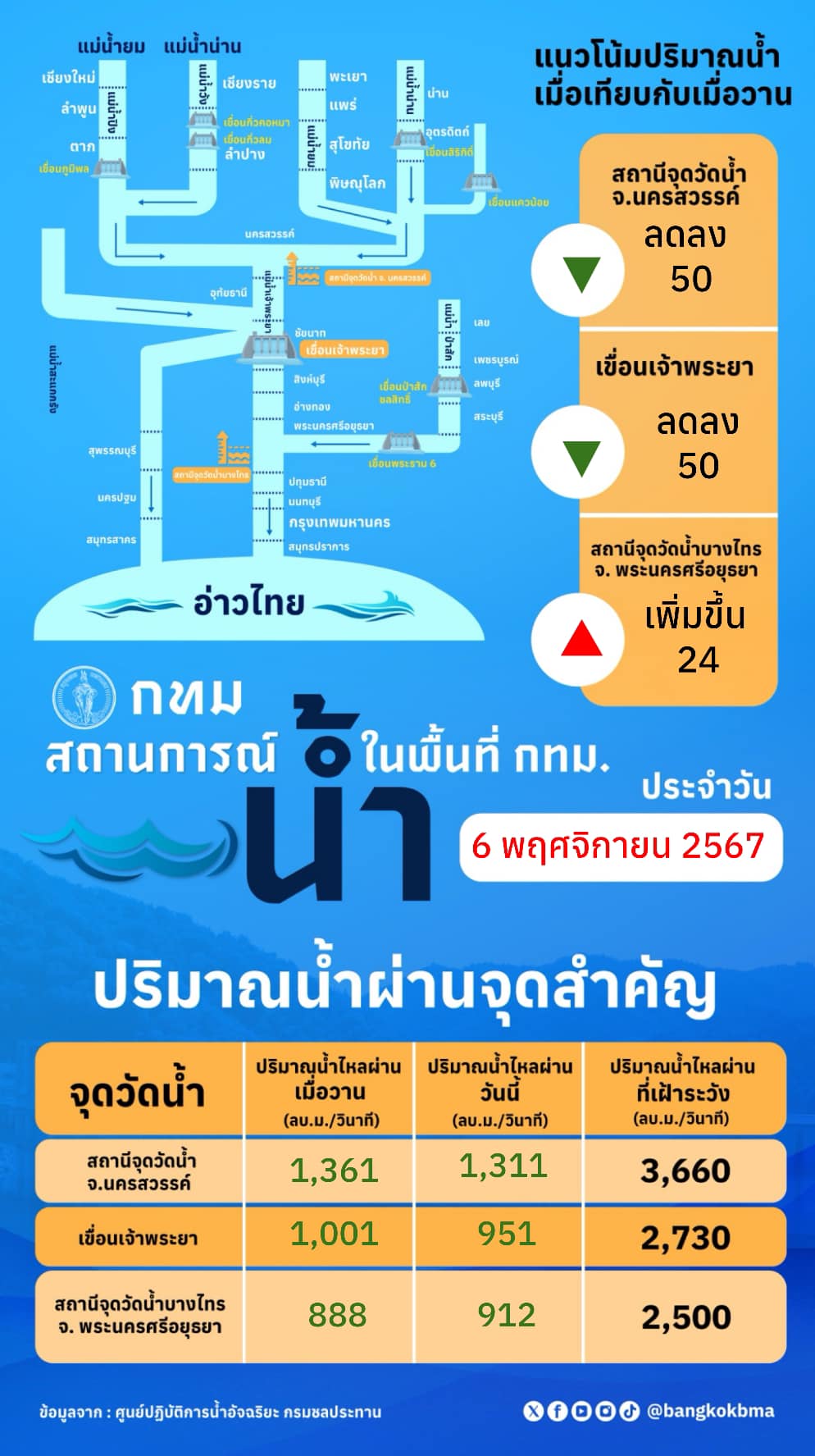 กรุงเทพมหานคร แจ้งสถานการณ์น้ำในพื้นที่ กทม. ประจำวันที่ วันที่ 6 พฤศจิกายน 2567 ณ เวลา 10.40 น. ปริมาณน้ำผ่านจุดสำคัญ สถานีจุดวัดน้ำ จ.นครสวรรค์ ปริมาณน้ำไหลผ่าน 1,311 ลบ.ม./วินาที ลดลง 50 ลบ.ม./วินาที ปริมาณน้ำไหลผ่านที่เฝ้าระวัง อยู่ที่ 3,660 ลบ.ม./วินาที, จุดวัดน้ำบริเวณเขื่อนเจ้าพระยา ปริมาณน้ำไหลผ่าน 951 ลบ.ม./วินาที ลดลง 50 ลบ.ม./วินาที ปริมาณน้ำไหลผ่านที่เฝ้าระวัง อยู่ที่ 2,730 ลบ.ม./วินาที, สถานีจุดวัดน้ำบางไทร จ.พระนครศรีอยุธยา ปริมาณน้ำไหลผ่าน 912 ลบ.ม./วินาที เพิ่มขึ้น 24 ลบ.ม./วินาที ปริมาณน้ำไหลผ่านที่เฝ้าระวัง อยู่ที่ 2,500 ลบ.ม./วินาที