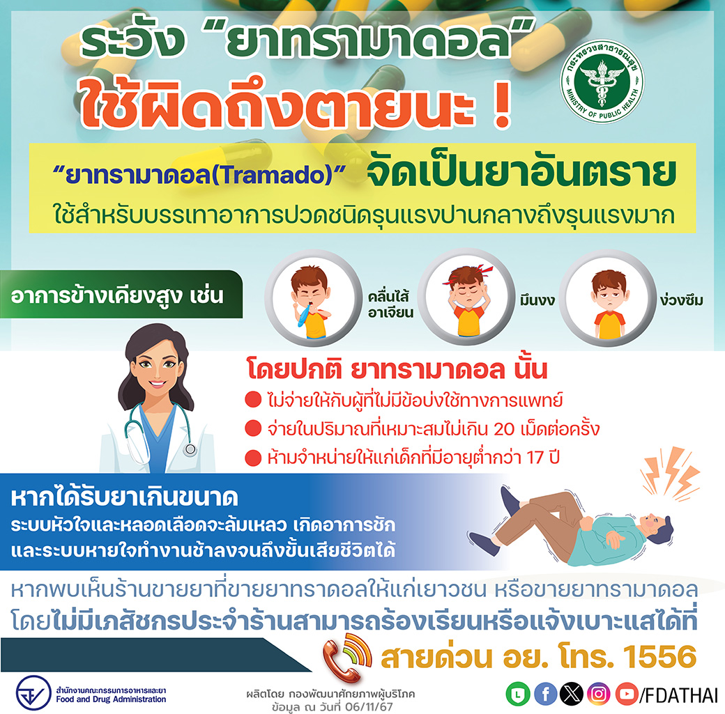 สำนักงานคณะกรรมการอาหารและยา แนะนำระวัง ยาทรามาดอล หรือ ทรามาดอล (Tramadol) ในทางที่ผิด อาจก่อให้เกิดอาการข้างเคียงสูง เช่น คลื่นไส้ อาเจียน มึนงง ง่วงซึม และหากได้รับยาเกินขนาด ระบบหัวใจและหลอดเลือดจะล้มเหลว เกิดอาการชัก และระบบหายใจทำงานช้าลงจนถึงขั้นเสียชีวิตได้ ดังนั้น ผู้รับอนุญาตขายยาและเภสัชกร จะต้องร่วมกันจัดทำบัญชีการซื้อ ขายที่ถูกต้อง เป็นจริง และเป็นปัจจุบัน เพื่อความปลอดภัยของผู้บริโภค