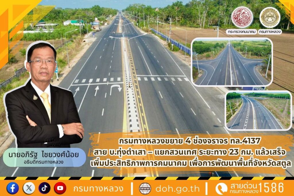 กรมทางหลวง โดยสำนักก่อสร้างทางที่ 1 ได้ดำเนินการก่อสร้างทางหลวงหมายเลข 4137 สาย บ.ทุ่งตำเสา – แยกสวนเทศ ระหว่าง กม.0+196 – กม.23+426 ระยะทาง 23.230 กิโลเมตร (กม.) พื้นที่ อ.ควนกาหลง และ อ.ท่าแพ จ.สตูล เป็น 4 ช่องจราจรแล้วเสร็จ เพิ่มประสิทธิภาพการเดินทางและการขนส่ง จ.สตูล