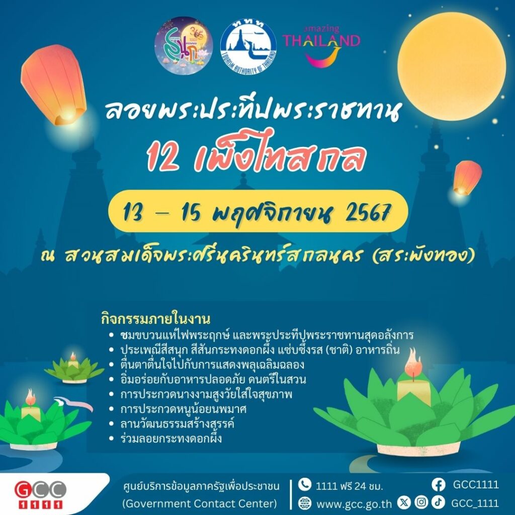 การท่องเที่ยวแห่งประเทศไทย สำนักงานนครพนม จัดงานเทศกาลลอยพระประทีปพระราชทาน สิบสองเพ็งไทสกล ประจำปี 2567 ระหว่างวันที่ 13 – 15 พฤศจิกายน 2567 ณ สวนสมเด็จพระศรีนครินทร์สกลนคร (สระพังทอง)