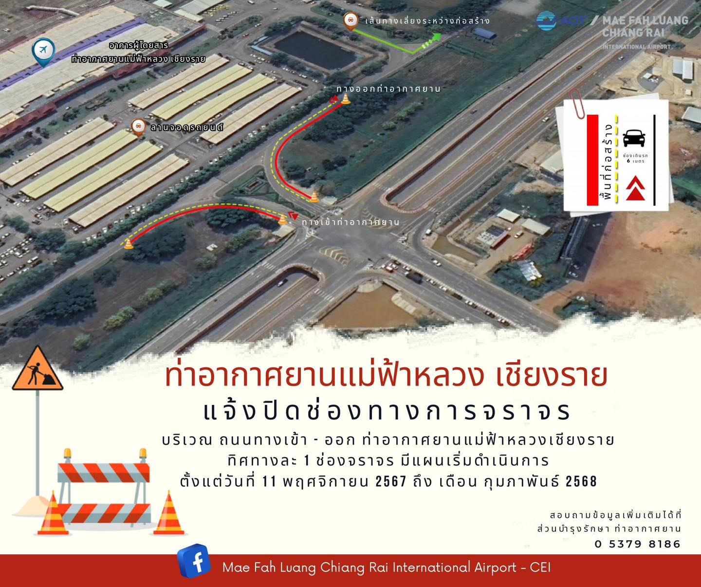 ขอแจ้งประชาสัมพันธ์ ท่าอากาศยานแม่ฟ้าหลวง เชียงราย (ทชร.) จะดำเนินงานก่อสร้างถนนทางเข้า – ออก จึงมีความจำเป็นต้องปิดช่องทางการจราจรทั้งบริเวณขาเข้า และขาออกท่าอากาศยานทิศทางละ 1 ช่องการจราจร ตั้งแต่วันจันทร์ ที่ 11 พฤศจิกายน 2567 เวลา 08.00 น. ถึง เดือนกุมภาพันธ์ 2568