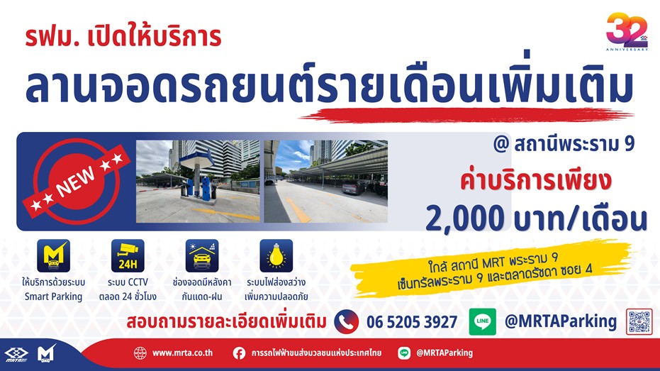 รฟม. เปิดให้บริการลานจอดรถยนต์รายเดือน เพิ่มเติม ณ สถานีพระราม 9 และเพิ่มที่จอดรถจักรยานยนต์ อีก 4 แห่ง เพื่ออำนวยความสะดวก และส่งเสริมให้ประชาชนใช้บริการขนส่งสาธารณะแทนรถส่วนบุคคลเพิ่มขึ้น ตั้งแต่บัดนี้เป็นต้นไป