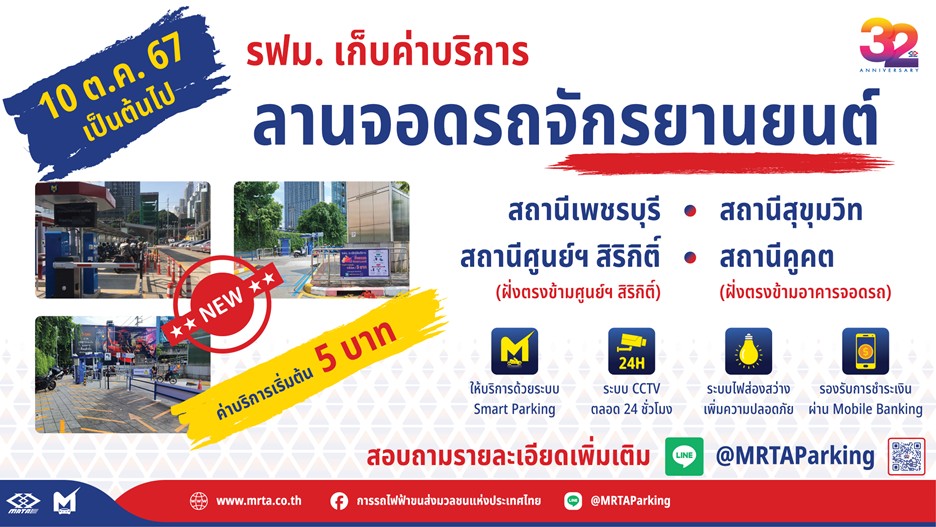 นอกจากนี้ รฟม. ยังได้พัฒนาอาคารและลานจอดรถทุกแห่งเป็นระบบจอดรถ Smart Parking พร้อมสิ่งอำนวยความสะดวกต่างๆ ได้แก่ ห้องน้ำ ตู้จำหน่ายเครื่องดื่มอัตโนมัติ (Vending Machine) กล้องโทรทัศน์วงจรปิด (CCTV) และเจ้าหน้าที่รักษาความปลอดภัย เป็นต้น โดยเปิดให้บริการทุกวัน ตั้งแต่เวลา 05.00 – 01.00 น. เพื่อให้ผู้ใช้บริการสามารถนำรถมาจอดและเดินทางต่อด้วยรถไฟฟ้า หรือระบบขนส่งสาธารณะอื่นๆ ได้อย่างสะดวกสบาย โดย รฟม. ได้มุ่งเน้นการพัฒนาการให้บริการ เพื่อตอบสนองความต้องการของประชาชนและส่งเสริมการใช้ระบบขนส่งมวลชนที่เป็นมิตรต่อสิ่งแวดล้อม ซึ่งการใช้บริการอาคารและลานจอดรถแล้วเดินทางต่อด้วยรถไฟฟ้า นอกจากจะช่วยลดการใช้รถยนต์ส่วนบุคคลแล้ว ยังเป็นการช่วยลดมลพิษทางอากาศที่ยั่งยืนอีกด้วย สอบถามรายละเอียดเพิ่มเติมได้ที่ Line ID : @MRTAParking หรือ แอปพลิเคชั่น MRTA Parking หรือ เว็บไซต์ รฟม. www.mrta.co.th และ Call Center รฟม. โทร. 0 2716 4044 “รฟม. ร่วมยกระดับเมือง ด้วยโครงข่ายรถไฟฟ้าขนส่งมวลชนและนวัตกรรม เพื่ออนาคตที่ยั่งยืน”
