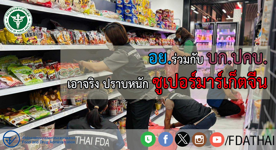 สำนักงานคณะกรรมการอาหารและยา ร่วมกับ กองบังคับการปราบปรามการกระทำความผิดเกี่ยวกับการคุ้มครองผู้บริโภค เข้าตรวจซูเปอร์มาร์เก็ตจีน พบอาหารไม่มี อย. ไม่มีฉลากภาษาไทย และเครื่องสำอางไม่จดแจ้ง ไม่มีฉลากภาษาไทย มีโทษปรับถึงจำคุก อย. และ ตำรวจ บก.ปคบ. จะร่วมกันตรวจเฝ้าระวังอย่างต่อเนื่องทั่วประเทศ