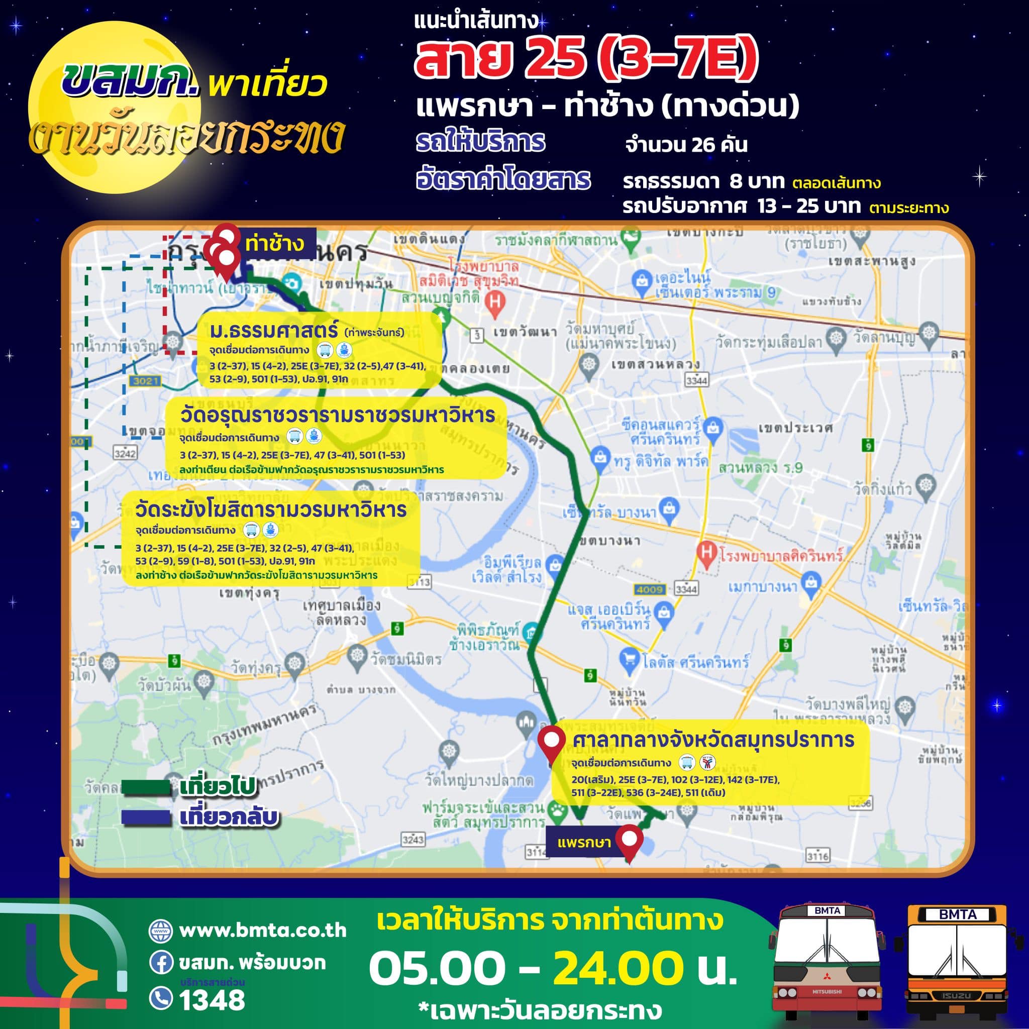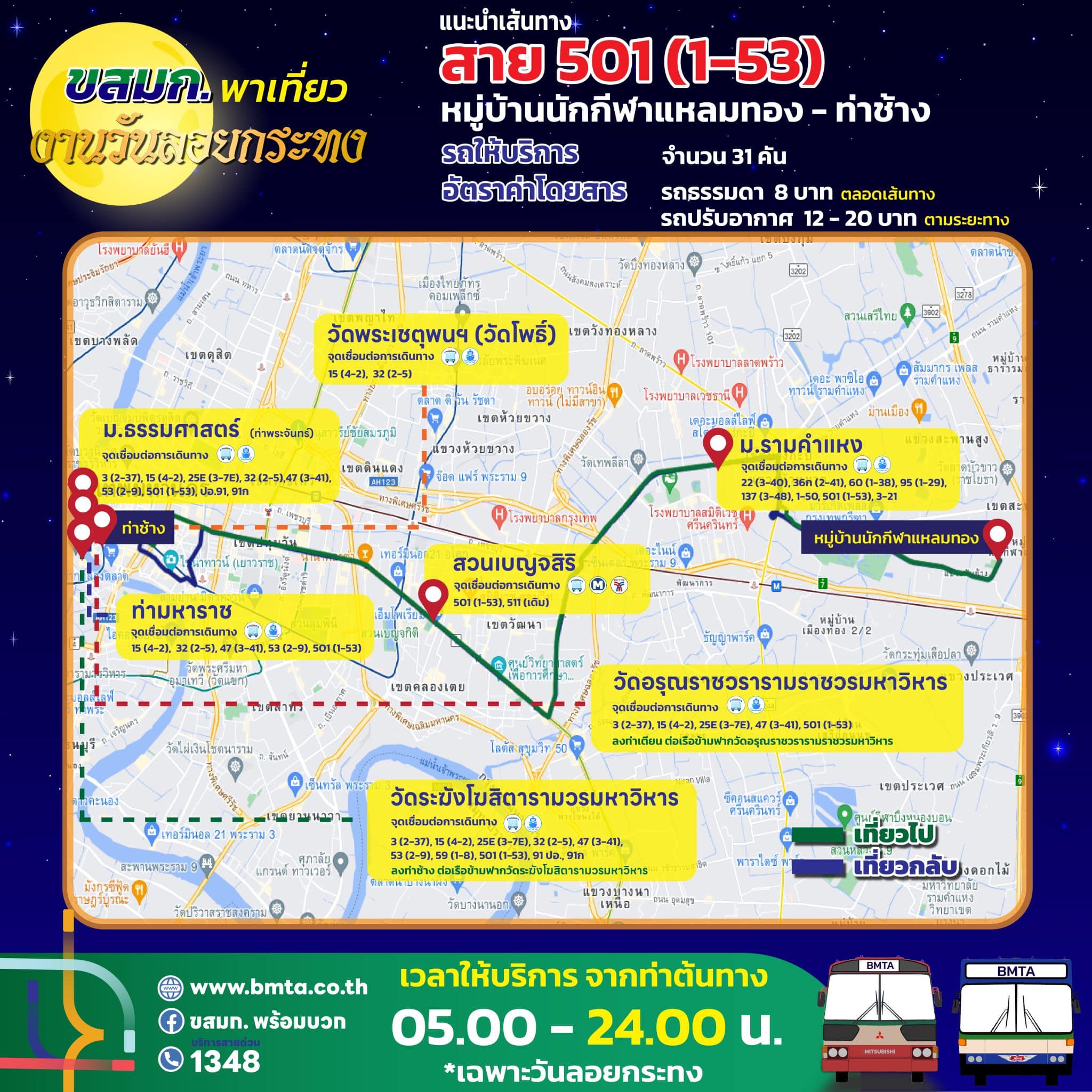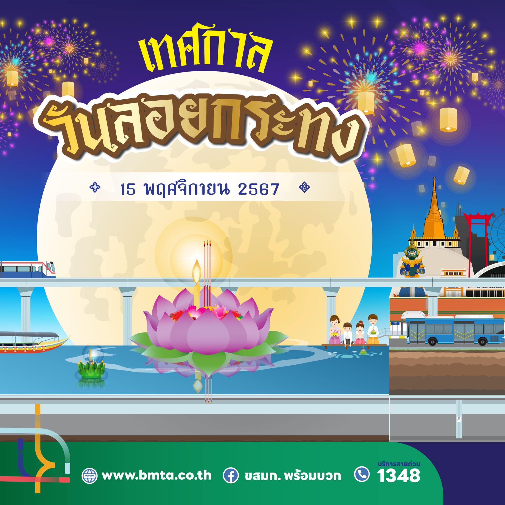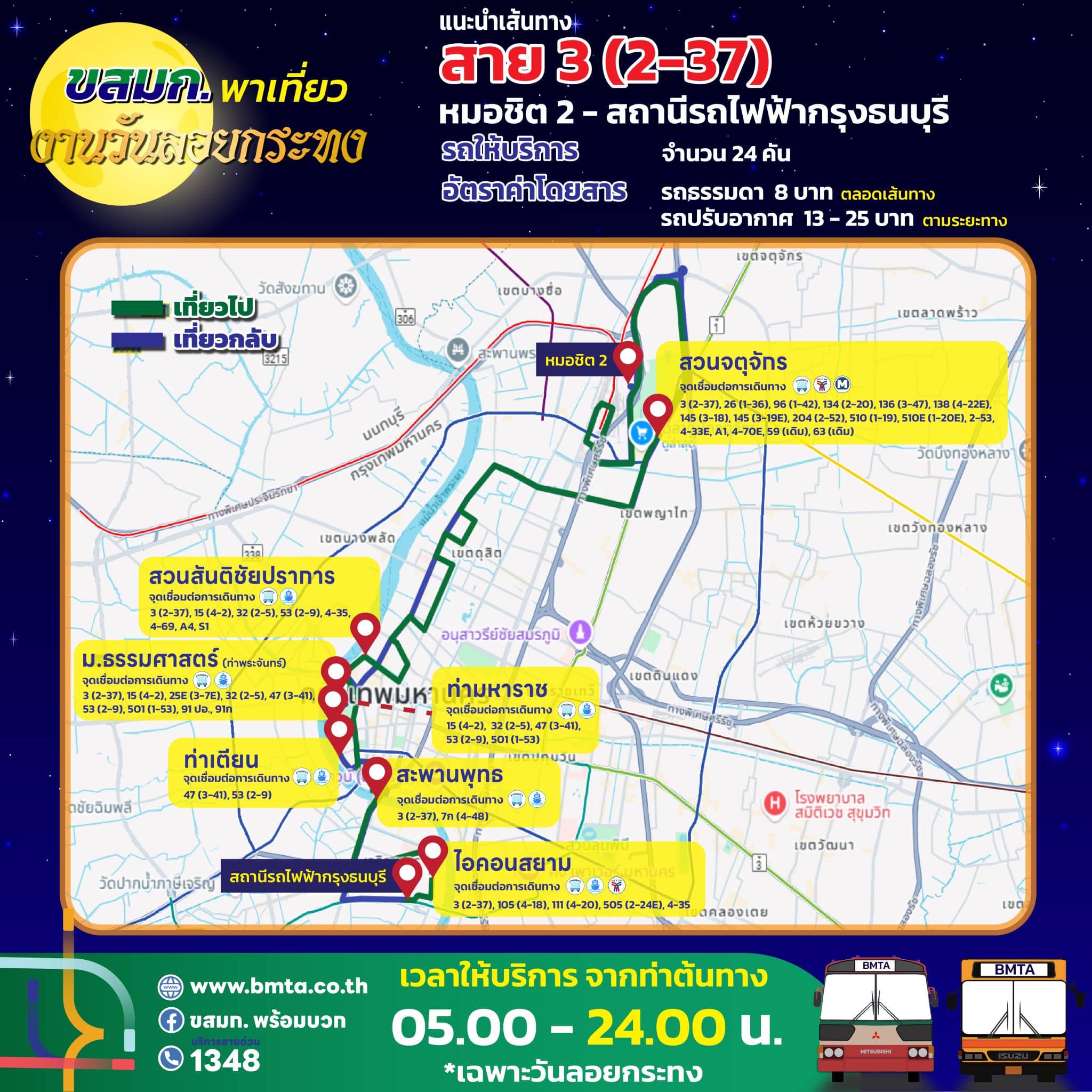 ขสมก. เตรียมจัดรถรองรับประชาชน เที่ยวงานวันลอยกระทง ประจำปี 2567 วันที่ 15 พฤศจิกายน 2567 ขยายเวลาเดินรถในเส้นทางที่วิ่งผ่านสถานที่จัดงาน คันสุดท้ายออกจากท่าต้นทาง ในเวลา 24.00 น.