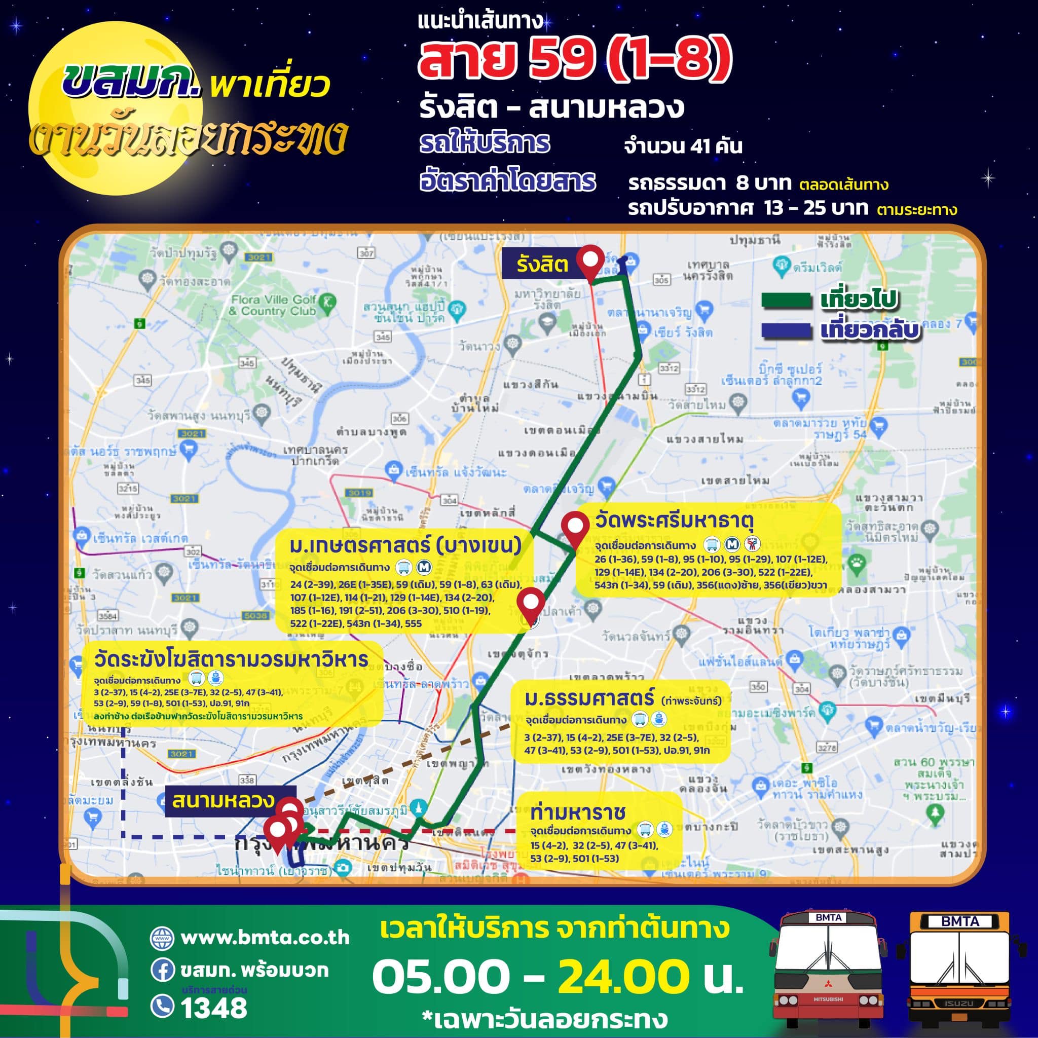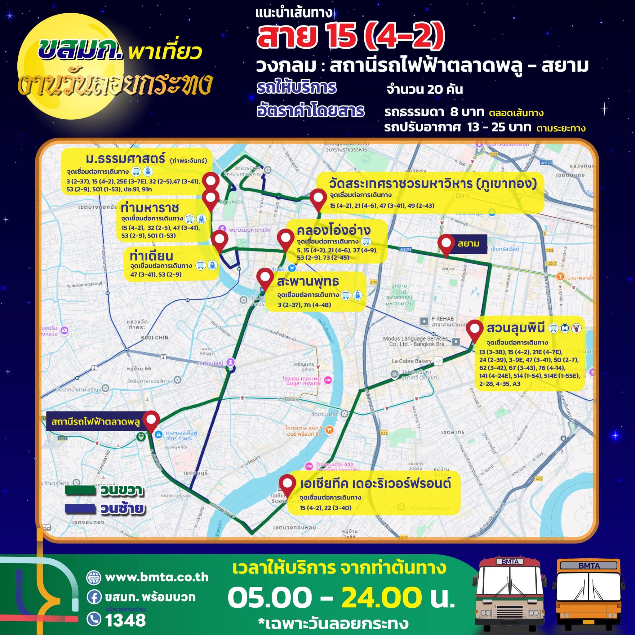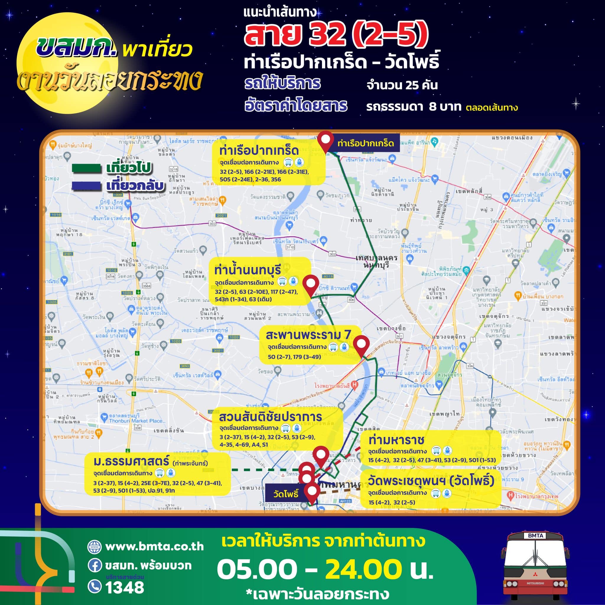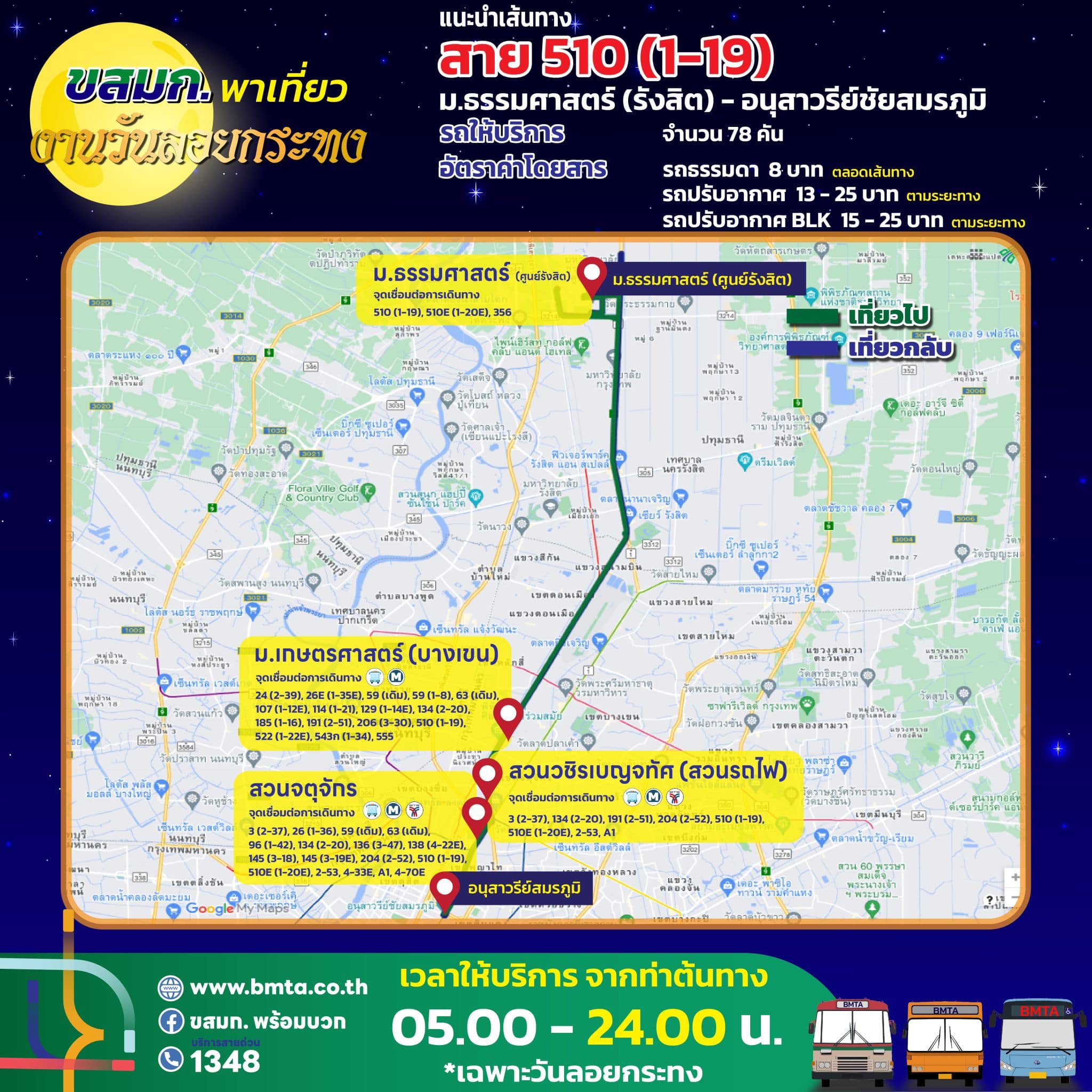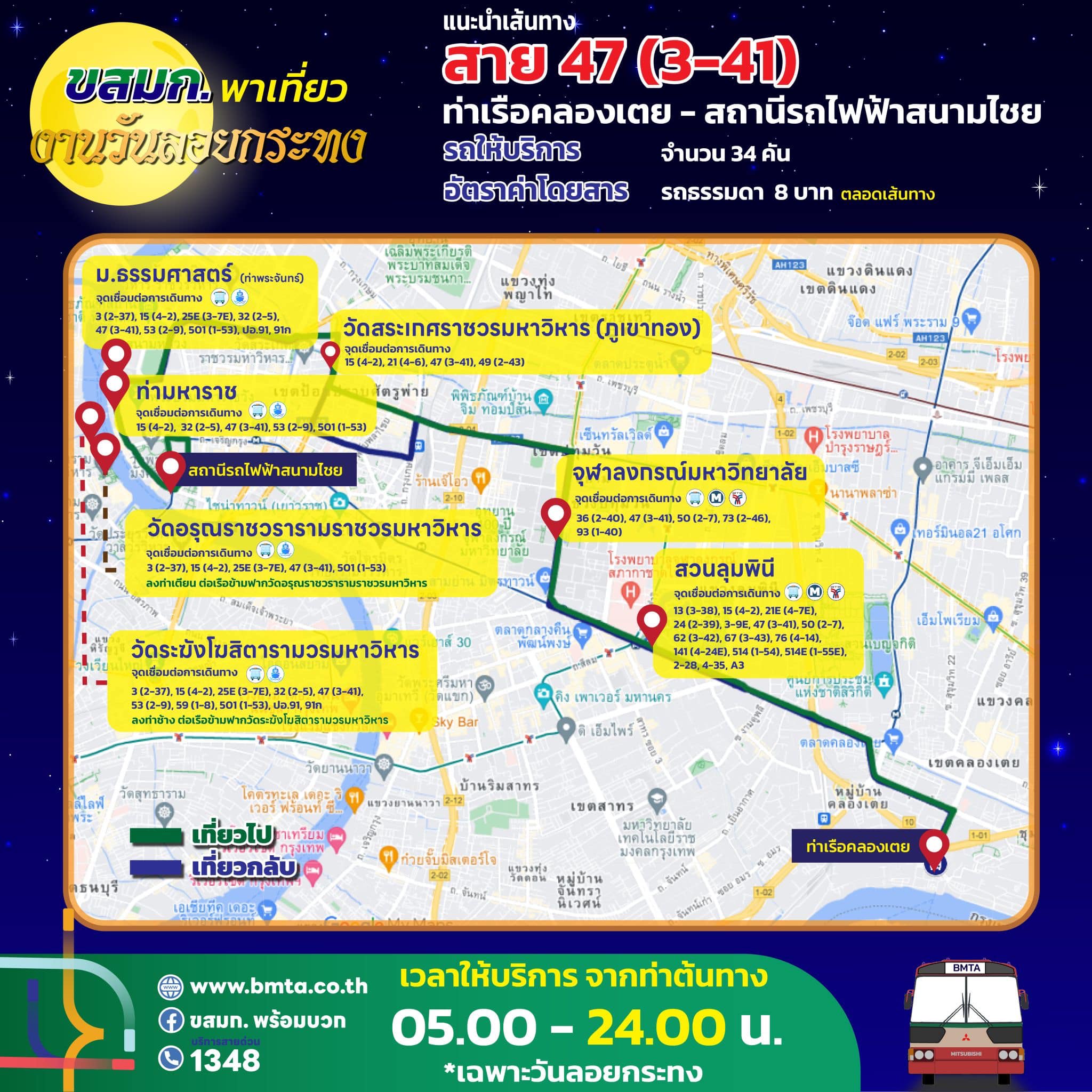 ขสมก. เตรียมจัดรถรองรับประชาชน เที่ยวงานวันลอยกระทง ประจำปี 2567 วันที่ 15 พฤศจิกายน 2567 ขยายเวลาเดินรถในเส้นทางที่วิ่งผ่านสถานที่จัดงาน คันสุดท้ายออกจากท่าต้นทาง ในเวลา 24.00 น.