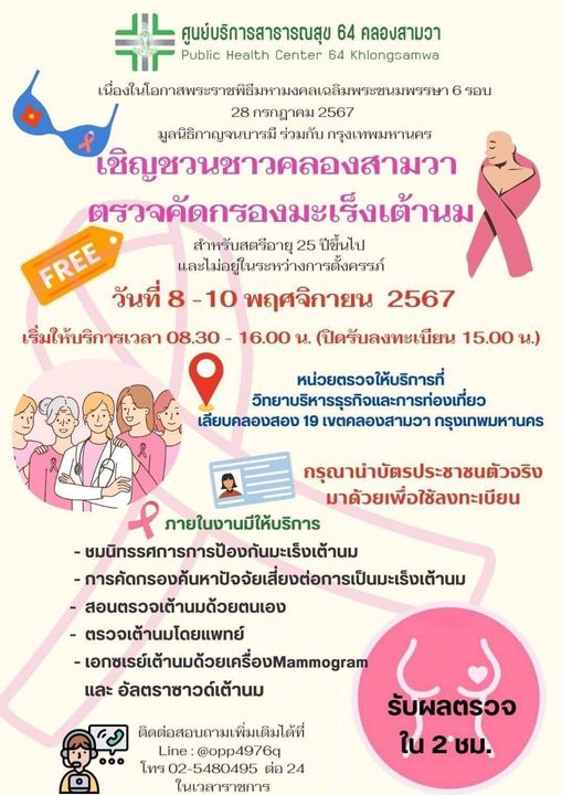 ศูนย์บริการสาธารณสุข 64 คลองสามวา สำนักอนามัย กรุงเทพมหานคร ร่วมกับมูลนิธิกาญจนบารมี ขอเชิญชวนตรวจคัดกรองมะเร็งเต้านม สำหรับสตรีอายุ 25 ปีขึ้นไป และไม่อยู่ในระหว่างการตั้งครรภ์ ฟรี ทุกสิทธิการรักษา (นำบัตรประชาชนตัวจริงมารับบริการเท่านั้น) วันที่ 8 – 10 พฤศจิกายน 2567 เวลา 08.30 – 16.00 น. (ปิดรับลงทะเบียน 15.00 น. ) ณ วิทยาลัยบริหารธุรกิจและการท่องเที่ยว ซอยเลียบคลองสอง 19 แขวงบางชัน เขตคลองสามวา กทม.