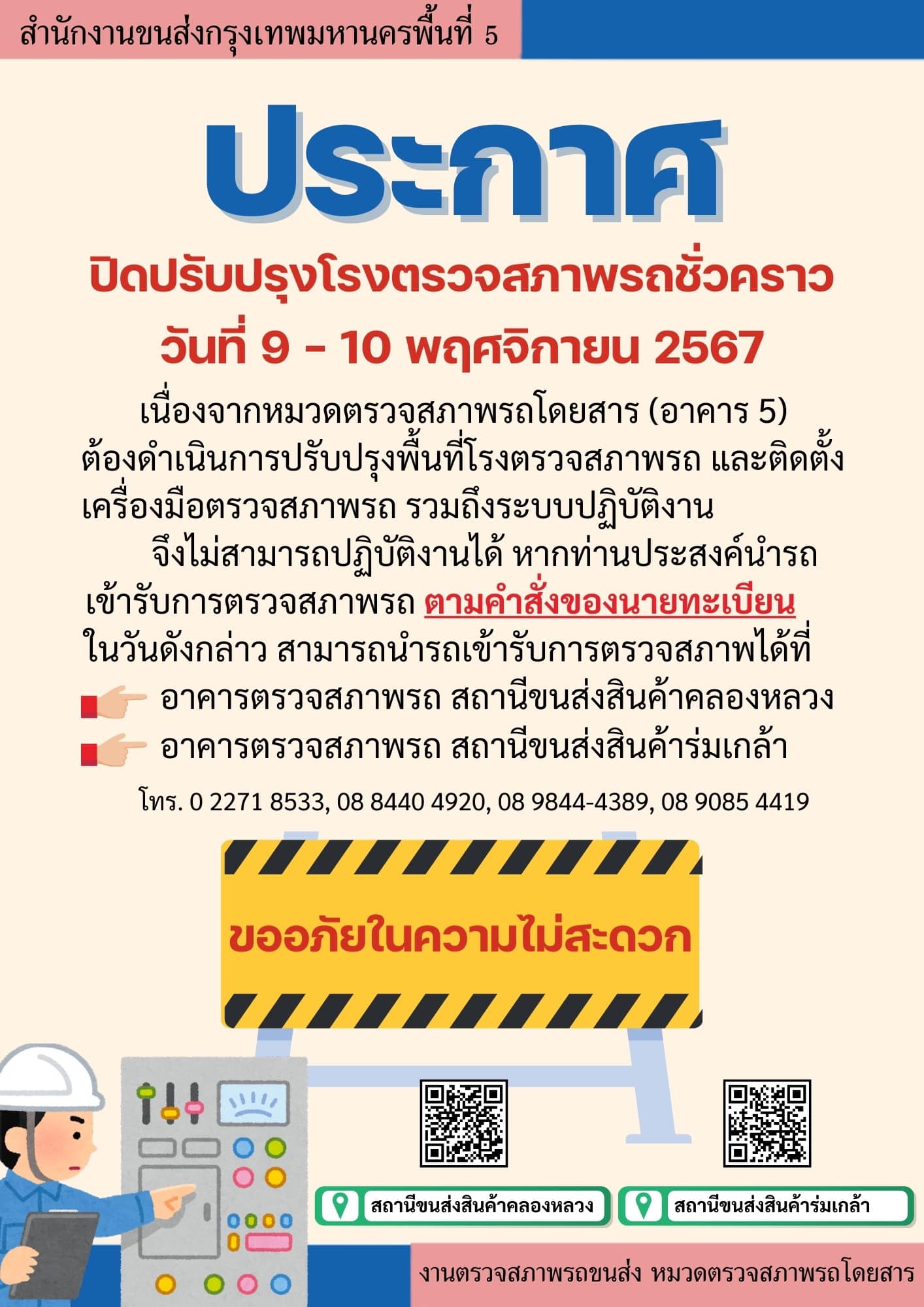 สำนักงานขนส่งกรุงเทพมหานครพื้นที่ 5 ประกาศปิดปรับปรุงโรงตรวจสภาพรถชั่วคราว วันที่ 9 – 10 พฤศจิกายน 2567 เนื่องจากหมวดตรวจสภาพรถโดยสาร (อาคาร 5) ต้องดำเนินการปรับปรุงพื้นที่โรงตรวจสภาพรถ และติดตั้งเครื่องมือตรวจสภาพรถ รวมถึงระบบปฏิบัติงาน จึงไม่สามารถปฏิบัติงานได้ หากท่านประสงค์นำรถเข้ารับการตรวจสภาพรถ ตามคำสั่งของนายทะเบียนในวันดังกล่าว สามารถนำรถเข้ารับการตรวจสภาพได้ที่