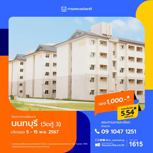 การเคหะแห่งชาติ เปิดจองโครงการที่อยู่อาศัยในทำเล จังหวัดนนทบุรี โครงการบ้านเอื้ออาทรนนทบุรี (วัดกู้ 3) อาคารชุด 5 ชั้น 1 ห้องนอน 1 ห้องน้ำ ราคาเริ่มต้น 5.54 แสนบาท จองเริ่มต้นเพียง 1,000 บาท เปิดจองตั้งแต่บัดนี้ – 15 พฤศจิกายน 2567 ณ ศูนย์ชุมชนโครงการบ้านเอื้ออาทรนนทบุรี (วัดกู้ 3)