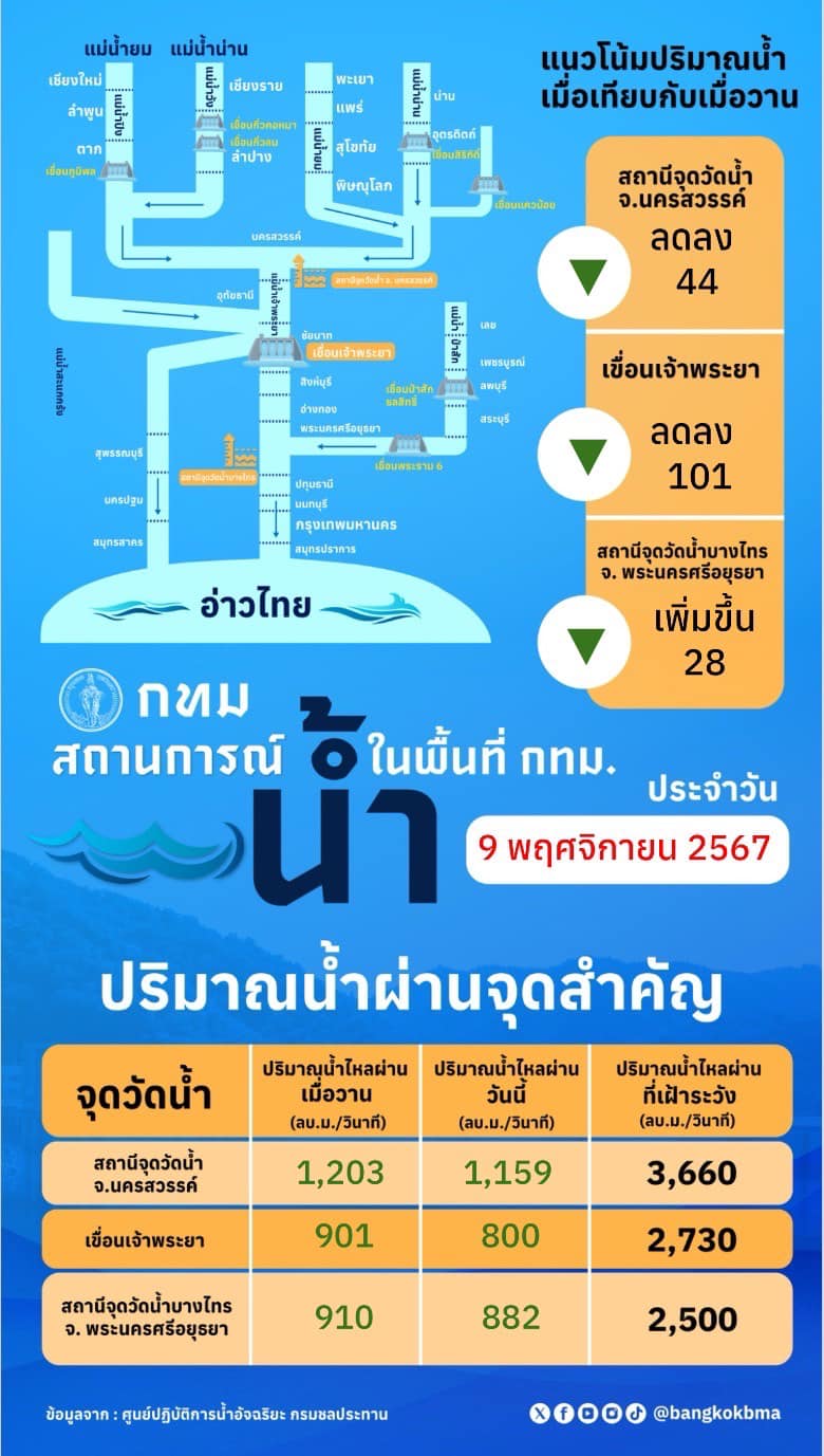 กรุงเทพมหานคร แจ้งสถานการณ์น้ำในพื้นที่ กทม. ประจำวันที่ วันที่ 9 พฤศจิกายน 2567 ณ เวลา 11.00 น. ปริมาณน้ำผ่านจุดสำคัญ สถานีจุดวัดน้ำ จ.นครสวรรค์ ปริมาณน้ำไหลผ่าน 1,159 ลบ.ม./วินาที ลดลง 44 ลบ.ม./วินาที ปริมาณน้ำไหลผ่านที่เฝ้าระวัง อยู่ที่ 3,660 ลบ.ม./วินาที, จุดวัดน้ำบริเวณเขื่อนเจ้าพระยา ปริมาณน้ำไหลผ่าน 800 ลบ.ม./วินาที ลดลง 101 ลบ.ม./วินาที ปริมาณน้ำไหลผ่านที่เฝ้าระวัง อยู่ที่ 2,730 ลบ.ม./วินาที, สถานีจุดวัดน้ำบางไทร จ.พระนครศรีอยุธยา ปริมาณน้ำไหลผ่าน 882 ลบ.ม./วินาที ลดลง 28 ลบ.ม./วินาที ปริมาณน้ำไหลผ่านที่เฝ้าระวัง อยู่ที่ 2,500 ลบ.ม./วินาที