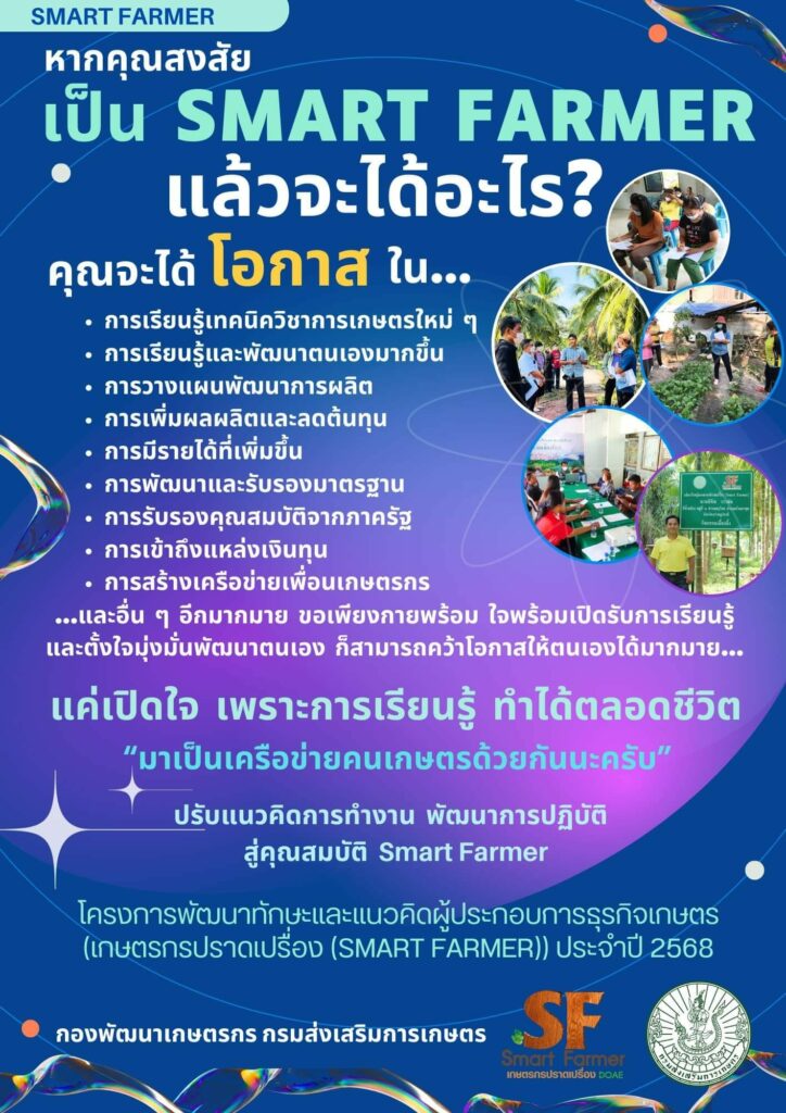 กรมส่งเสริมการเกษตร ขอเชิญชวนเกษตรกรเข้าร่วม “โครงการพัฒนาเกษตรกรปราดเปรื่อง (Smart Farmer) ปี 2568” เพื่อพัฒนาผู้ประกอบการเกษตรให้มีทักษะการจัดทำแผนธุรกิจที่ดี