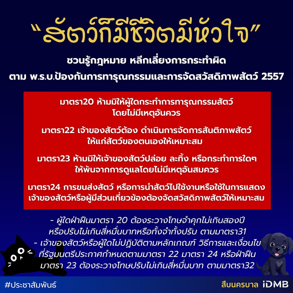 • มาตรา20 ห้ามมิให้ผู้ใดกระทำการทารุณกรรมสัตว์โดย ไม่มีเหตุอันควร “กระทำทารุณกรรมสัตว์ เพราะเป็นการกระทำที่ทำให้สัตว์เจ็บป่วย ได้รับความทุกข์ทรมาน หรืออาจถึงแก่ความตายได้”