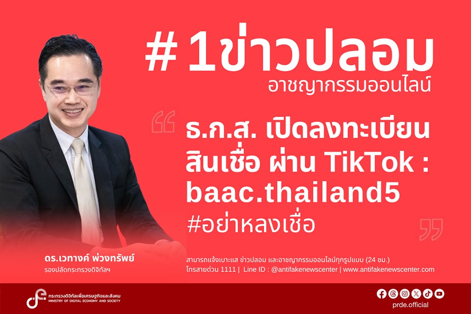 ดีอี เตือน กลโกง “โจรออนไลน์” ปล่อยข่าวปลอม “ธ.ก.ส. เปิดลงทะเบียนสินเชื่อ ผ่านบัญชี TikTok baac.thailand5” ขออย่าเชื่อ-แชร์ หวั่นสูญเงิน-ข้อมูลส่วนบุคคล