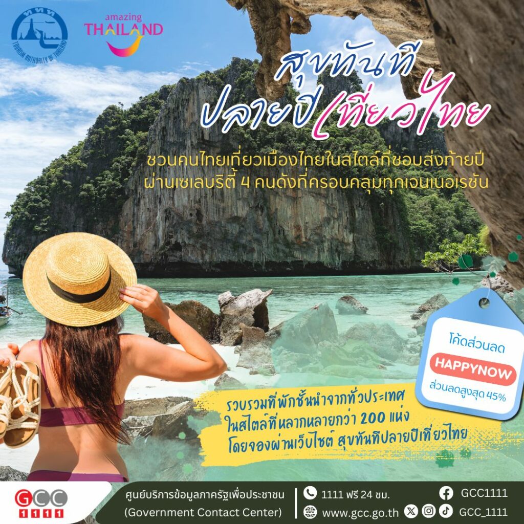 การท่องเที่ยวแห่งประเทศไทย (ททท.) เปิดตัวโครงการ “สุขทันที ปลายปีเที่ยวไทย” มุ่งสร้างกระแสการเดินทางภายในประเทศช่วงปลายปี ด้วยการเชิญชวนคนไทยออกเดินทางท่องเที่ยวผ่านเซเลบริตี้ 4 คนดังที่ครอบคลุมทุกเจนเนอเรชัน พร้อมเปิดเว็บไซต์สุขทันทีปลายปีเที่ยวไทย https://xn--22c6baaajpa6dcb4a4a5a1iua2cfb0cymrd3d.com/ ที่รวบรวมที่พักชั้นนำจากทั่วประเทศในสไตล์ที่หลากหลายกว่า 200 แห่ง ให้สามารถเลือกโปรโมชั่นส่วนลดสุดพิเศษ โดยจองผ่านเว็บไซต์ซึ่งมีส่วนลดตั้งแต่ 15 – 35% และสามารถรับส่วนลดเพิ่มอีก 5 – 10% เมื่อจองผ่านเว็บไซต์นี้ ทำให้ผู้จองได้รับส่วนลดสูงสุดถึง 45%