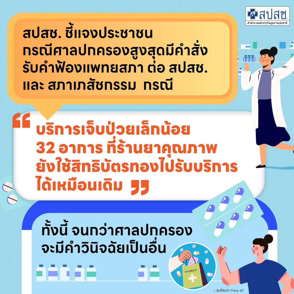 สปสช. ชี้แจงประชาชน กรณีศาลปกครองสูงสุดมีคำสั่งให้รับฟ้องคำร้องของแพทยสภา ต่อ สปสช. และสภาเภสัชกรรม กรณี “บริการเจ็บป่วยเล็กน้อย 32 อาการ ที่ร้านยาคุณภาพ ยังใช้สิทธิบัตรทองไปรับบริการได้เหมือนเดิม” ทั้งนี้ จนกว่าศาลปกครองจะมีคำวินิจฉัยเป็นอื่น
