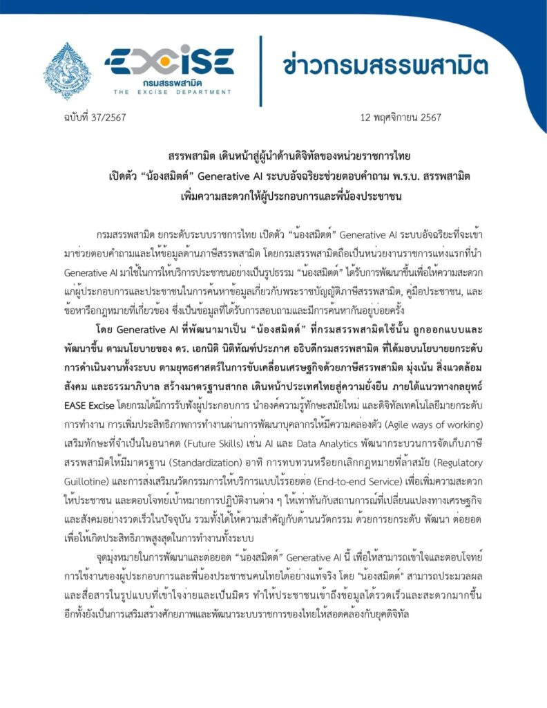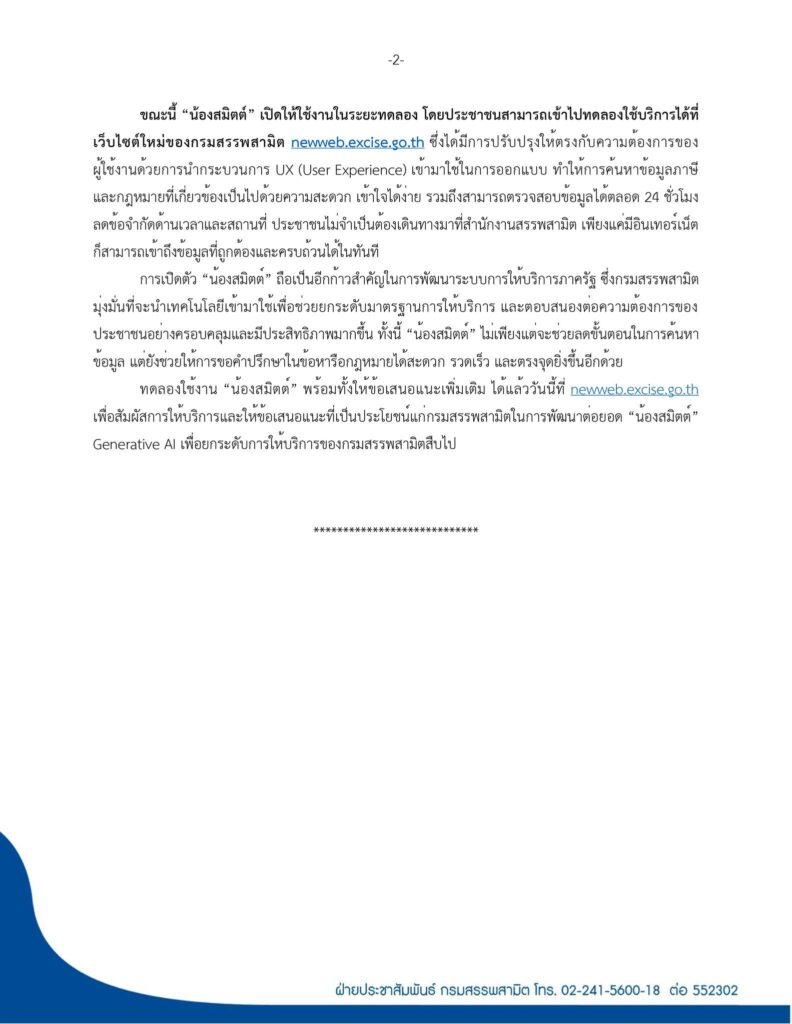 กรมสรรพสามิต เชิญชวนทดลองใช้ AI Chatbot : Mr.Smitt (น้องสมิตต์) และ Website ใหม่ของกรมสรรพสามิตเพื่อรองรับ Digital Transformation ในการอำนวยความสะดวกให้แก่ผู้ประกอบการและประชาชนในการค้นหาข้อมูลเกี่ยวกับพระราชบัญญัติภาษีสรรพสามิต, คู่มือประชาชน, และข้อหารือกฎหมายที่เกี่ยวข้อง ซึ่งเป็นข้อมูลที่ได้รับการสอบถามและมีการค้นหากันอยู่บ่อยครั้งโดยเปิดให้ใช้งานในระยะทดลอง ได้ที่ www.newweb.excise.go.th สามารถตรวจสอบข้อมูลได้ตลอด 24 ชั่วโมง ลดข้อจำกัดด้านเวลาและสถานที่ ประชาชนไม่จำเป็นต้องเดินทางมาที่สำนักงานสรรพสามิต