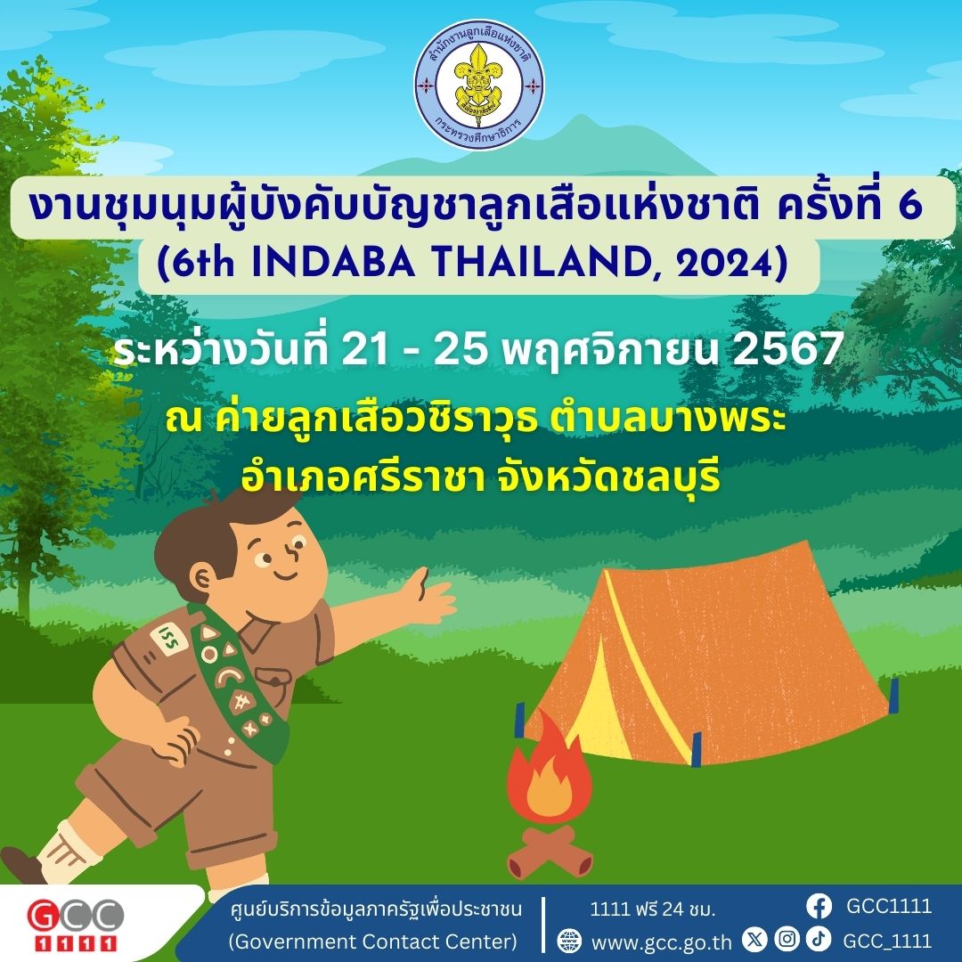 สำนักงานลูกเสือแห่งชาติ กระทรวงศึกษาธิการ จัดงานชุมนุมผู้บังคับบัญชาลูกเสือแห่งชาติ ครั้งที่ 6 พ.ศ. 2567 (6th INDABA THAILAND, 2024) เพื่อเฉลิมพระเกียรติพระบาทสมเด็จพระเจ้าอยู่หัว ประมุขของคณะลูกเสือแห่งชาติ เนื่องในโอกาสพระราชพิธีมหามงคลเฉลิมพระชนมพรรษา 6 รอบ 72 พรรษา ระหว่างวันที่ 21 – 25 พฤศจิกายน 2567 ณ ค่ายลูกเสือวชิราวุธ และสำนักงานลูกเสือแห่งชาติ ตำบลบางพระ อำเภอศรีราชา จังหวัดชลบุรี