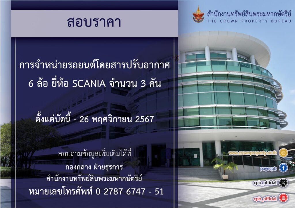 - สำนักงานทรัพย์สินพระมหากษัตริย์ เปิดสอบราคาการจำหน่ายรถยนต์โดยสารปรับอากาศ 6 ล้อ ยี่ห้อ SCANIA จำนวน 3 คัน
