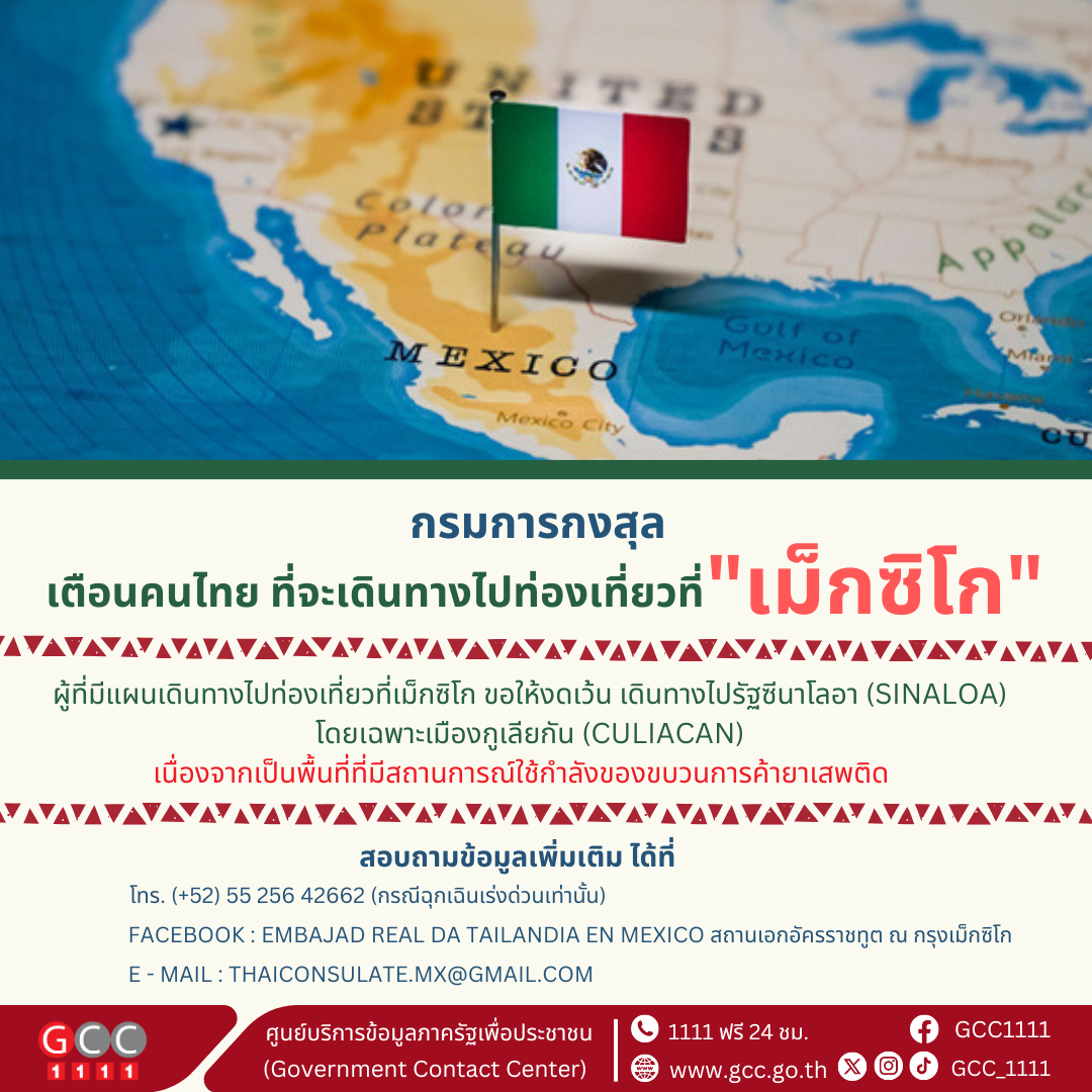 กรมการกงสุล เตือนคนไทย ที่จะเดินทางไปท่องเที่ยวที่ “เม็กซิโก” ผู้ที่มีแผนเดินทางไปท่องเที่ยวที่เม็กซิโก ขอให้งดเว้นเดินทางไปรัฐซีนาโลอา (Sinaloa) โดยเฉพาะเมืองกูเลียกัน (Culiacan) เนื่องจากเป็นพื้นที่ที่มีสถานการณ์ใช้กำลังของขบวนการค้ายาเสพติด