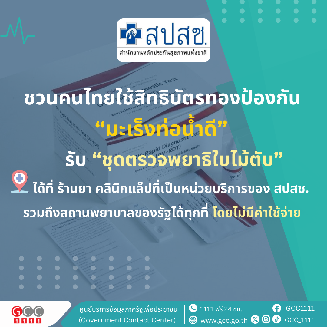 สำนักงานหลักประกันสุขภาพแห่งชาติ ชวนคนไทยใช้สิทธิบัตรทองป้องกัน ”มะเร็งท่อน้ำดี” รับ “ชุดตรวจพยาธิใบไม้ตับ” ประชาชนไทยที่อายุ 15 ปีขึ้นไปทุกสิทธิ ที่คิดว่าตนเองมีความเสี่ยงจะมีเชื้อพยาธิใบไม้ตับ เช่น ชื่นชอบกินอาหารสุกๆ ดิบๆ เคยมีประวัติการกินยาถ่ายพยาธิมาก่อน หรือเคยติดเชื้อพยาธิใบไม้ตับมาก่อน สามารถขอรับชุดตรวจตรวจพยาธิใบไม้ตับสำเร็จรูปชนิดเร็ว (OV-RDT) ได้ที่ ร้านยา คลินิกแล็ปที่เป็นหน่วยบริการของ สปสช. รวมถึงสถานพยาบาลของรัฐได้ทุกที่ โดยไม่มีค่าใช้จ่าย ซึ่งเป็นอีกทางเลือกสำหรับประชาชนในการคัดกรอง และดูแลุสุขภาพของตนเองเพื่อป้องกันโรคร้ายนี้ได้
