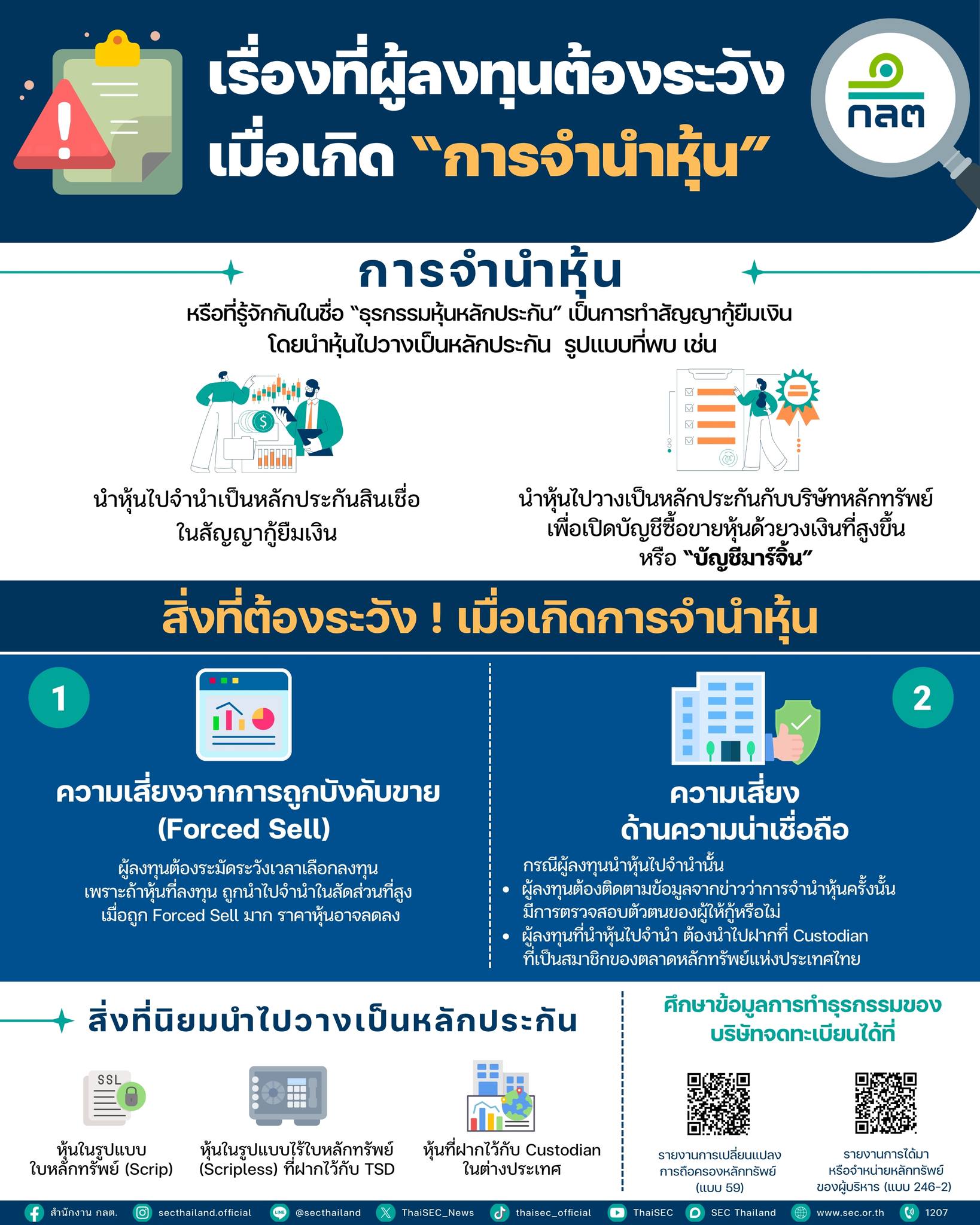 สำนักงานคณะกรรมการกำกับหลักทรัพย์และตลาดหลักทรัพย์ แนะนำเรื่องที่ผู้ลงทุนต้องระวัง เมื่อเกิด การจำนำหุ้น