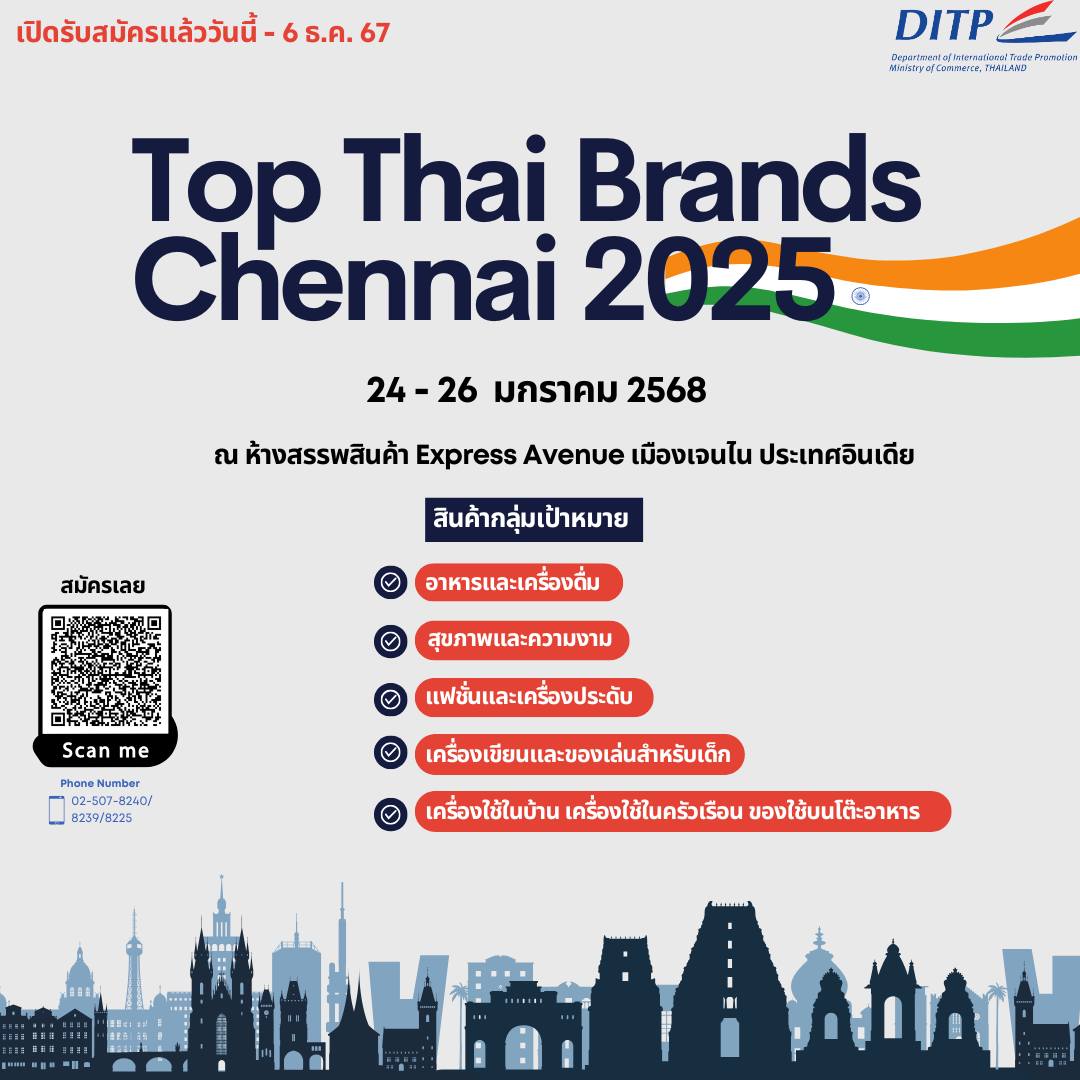 กรมส่งเสริมการค้าระหว่างประเทศ จัดงานแสดงสินค้า Top Thai Brands 2025 ระหว่างวันที่ 24 – 26 มกราคม 2568 ณ เมืองเจนไน สาธารณรัฐอินเดีย โดยรับสมัครผู้ประกอบการไทยที่พร้อมเดินทางไปเมืองเจนไน เพื่อเข้าร่วมกิจกรรมงานแสดงสินค้าด้วยตนเอง ประกอบด้วยกลุ่มสินค้า