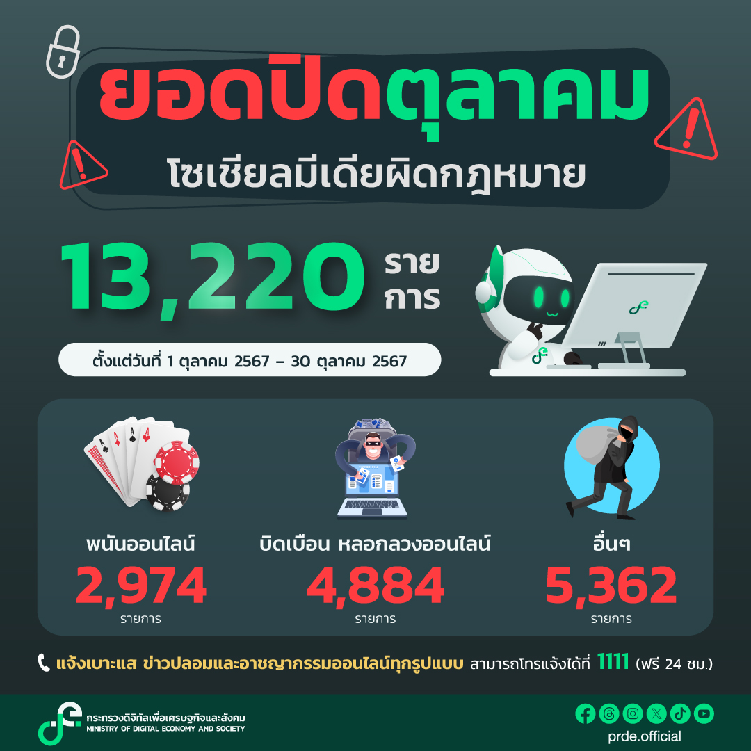 กระทรวงดิจิทัลฯ เปิดเผยสถิติเดือน ต.ค. ปิดกั้นโซเชียลมีเดีย เพจ และ URL ผิดกฎหมาย 13,220 รายการ