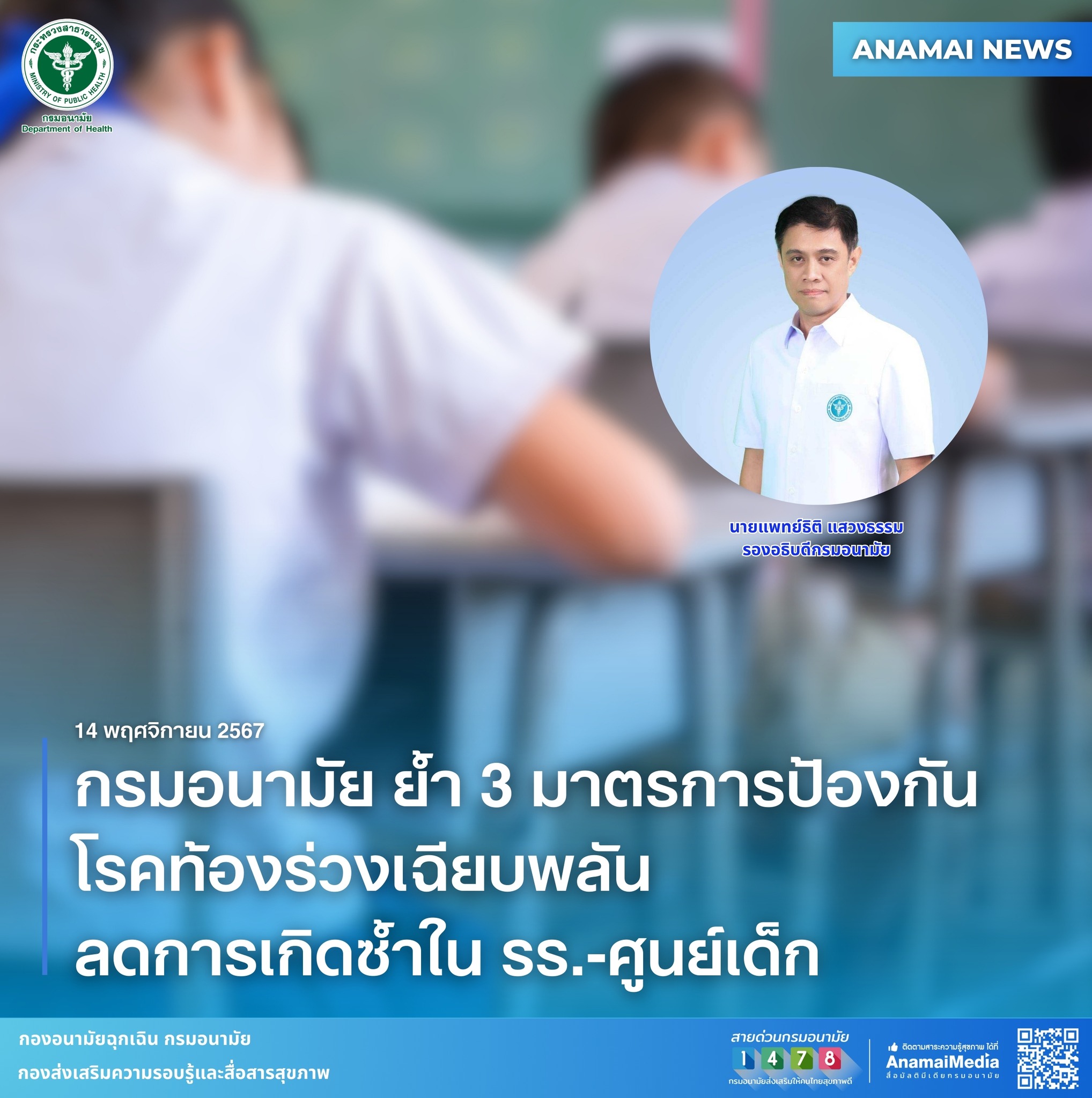 นายแพทย์ธิติ รองอธิบดีกรมอนามัย กล่าวต่อไปว่า จากเหตุการณ์ดังกล่าวถือเป็นสัญญาณเตือนให้สถานประกอบกิจการและหน่วยงานที่เกี่ยวข้อง ต้องเร่งกำหนดมาตรการควบคุม กำกับด้านสุขาภิบาลและสุขอนามัย ทั้งในสถานประกอบการที่เกี่ยวกับการผลิตอาหาร น้ำบริโภค รวมทั้งสถานที่เสี่ยงการเกิดโรคอุจจาระร่วงเฉียบพลันแบบกลุ่มก้อน เช่น โรงเรียนศูนย์เด็กเล็ก ค่ายทหาร ดังนี้ 1) สถานประกอบการ ได้แก่ สถานประกอบการผลิตสะสม แบ่งบรรจุและค้าส่งน้ำแข็ง น้ำดื่ม ร้านจำหน่ายอาหารในพื้นที่ปฏิบัติให้เป็นไปตามกฎหมายว่าด้วยการสาธารณสุขอย่างเคร่งครัด ในเรื่องการขอรับใบอนุญาตประกอบกิจการจากหน่วยงานราชการส่วนท้องถิ่น เพื่อให้เกิดการควบคุม กำกับ การจัดการสุขลักษณะของสถานที่ให้สะอาดไม่เป็นแหล่งของสัตว์แมลงนำโรค ล้างภาชนะบรรจุน้ำแข็ง หรือถังเก็บน้ำแข็งให้สะอาด รวมทั้งการดูแลสุขอนามัยที่ดีของผู้ปรุงประกอบอาหาร ผู้สัมผัสอาหารและน้ำดื่ม โดยหน่วยงานท้องถิ่น ควรทำการตรวจเฝ้าระวังเชิงรุกในพื้นที่รับผิดชอบ หากพบสถานประกอบกิจการในพื้นที่รับผิดชอบมีการดำเนินกิจการที่ไม่ถูกสุขลักษณะหรือไม่ปฏิบัติตามข้อบัญญัติท้องถิ่นและกฎหมายที่เกี่ยวข้อง โดยให้หน่วยงานราชการส่วนท้องถิ่นในฐานะเจ้าพนักงานท้องถิ่นตามกฎหมาย สามารถออกคำแนะนำทางปกครองทันที เพื่อระงับหรือลดความเสี่ยงที่ส่งผลกระทบต่อสุขภาพประชาชน 2) โรงเรียน ศูนย์เด็กเล็ก ค่ายทหารต้องกำหนดให้มีการตรวจประเมินคุณภาพน้ำใช้ น้ำดื่มอย่างต่อเนื่องโดยเฉพาะการตรวจวัดค่าคลอรีนอิสระในน้ำ รวมทั้งตรวจตราระบบกรองน้ำหรือระบบฆ่าเชื้อโรคต่าง ๆ ให้มีประสิทธิภาพอยู่เสมอ นอกจากนี้ ต้องจัดให้มีจุดล้างมือพร้อมสบู่หรือเจลแอลกอฮอล์ในโรงเรียนที่เพียงพอ พร้อมทั้งให้ความรู้แก่นักเรียนในการดูแลสุขภาพและส่งเสริมพฤติกรรมอนามัยส่วนบุคคลที่ดีป้องกันโรค และ 3) ประชาชน ต้องมีความตระหนัก ดูแลสุขอนามัยของตนเองและครอบครัวเลือกกินอาหารปรุงสุกใหม่อยู่เสมอ ใช้ช้อนกลางของตนเอง ล้างมือด้วยน้ำสะอาดและสบู่ หรือใช้เจลแอลกอฮอล์ทำความสะอาดมือและเลือกรับประทานอาหารในร้านหน่ายอาหารที่สะอาด หากพบอาหารที่มีลักษณะ สี กลิ่นผิดปกติต้องหลีกเลี่ยงไม่รับประทาน เพื่อลดความเสี่ยงการระบาดของโรคอุจจาระร่วงเฉียบพลัน