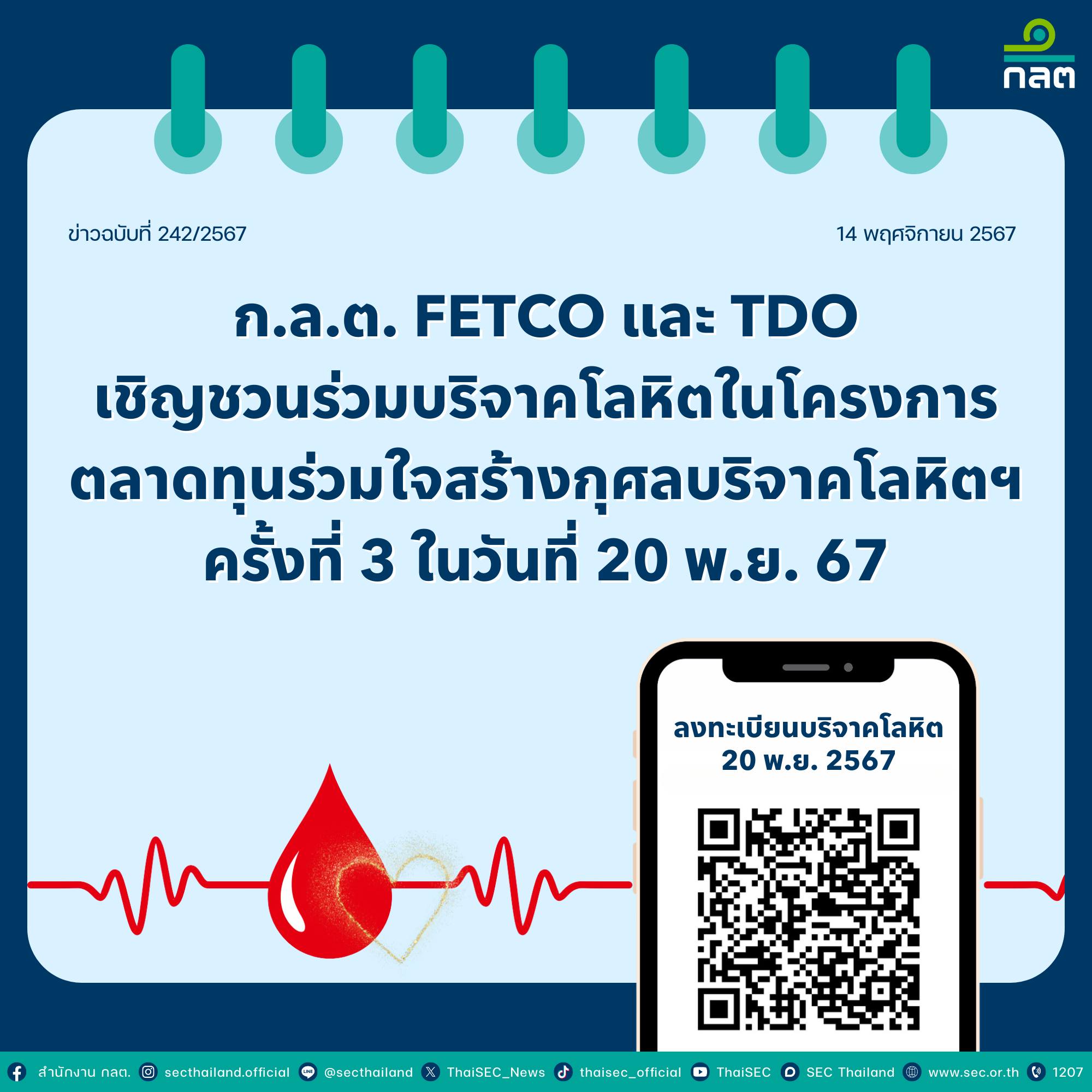 ก.ล.ต. ร่วมกับ FETCO และ TDO เชิญชวนร่วมบริจาคโลหิต
