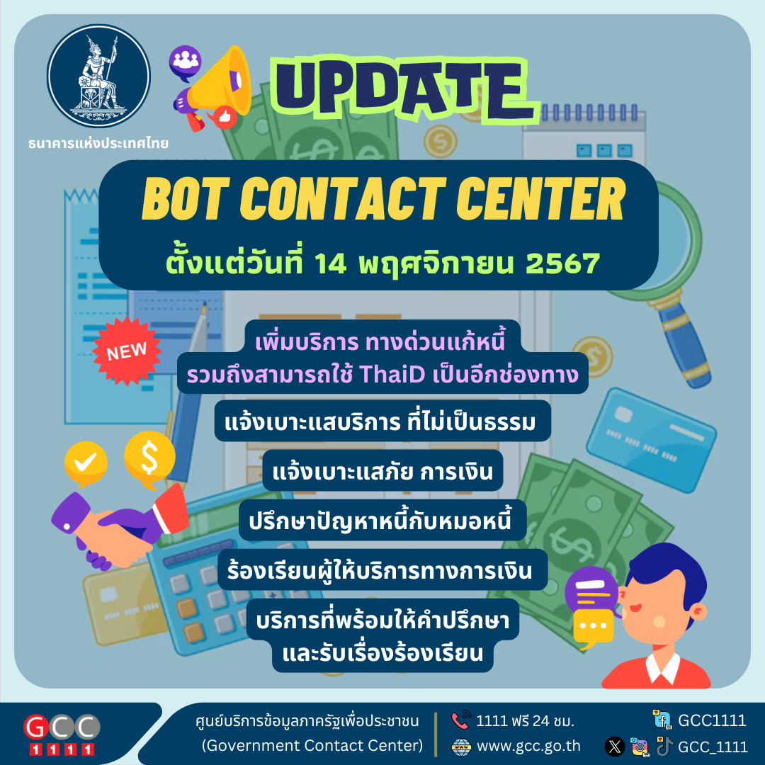 ธนาคารแห่งประเทศไทย อัพเดต BOT Contact Center ตั้งแต่วันที่ 14 พ.ย. 67