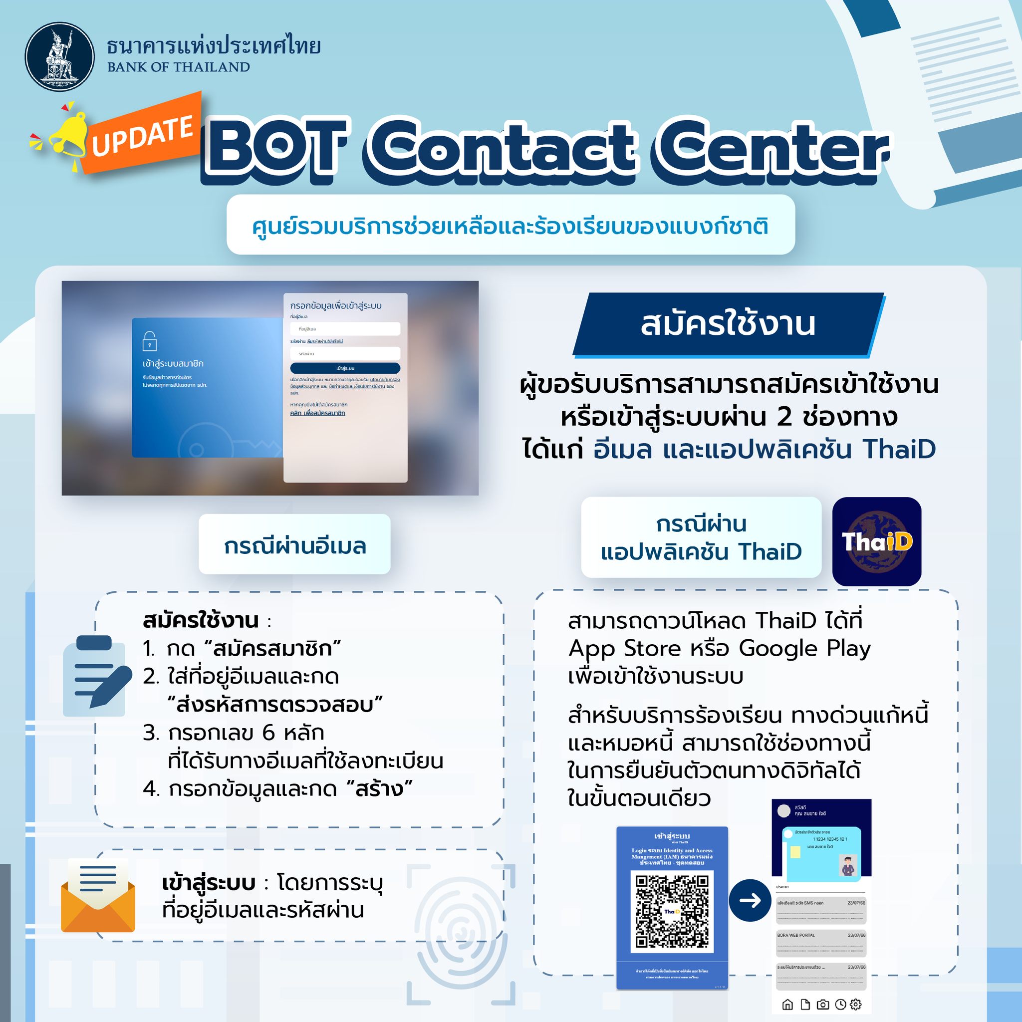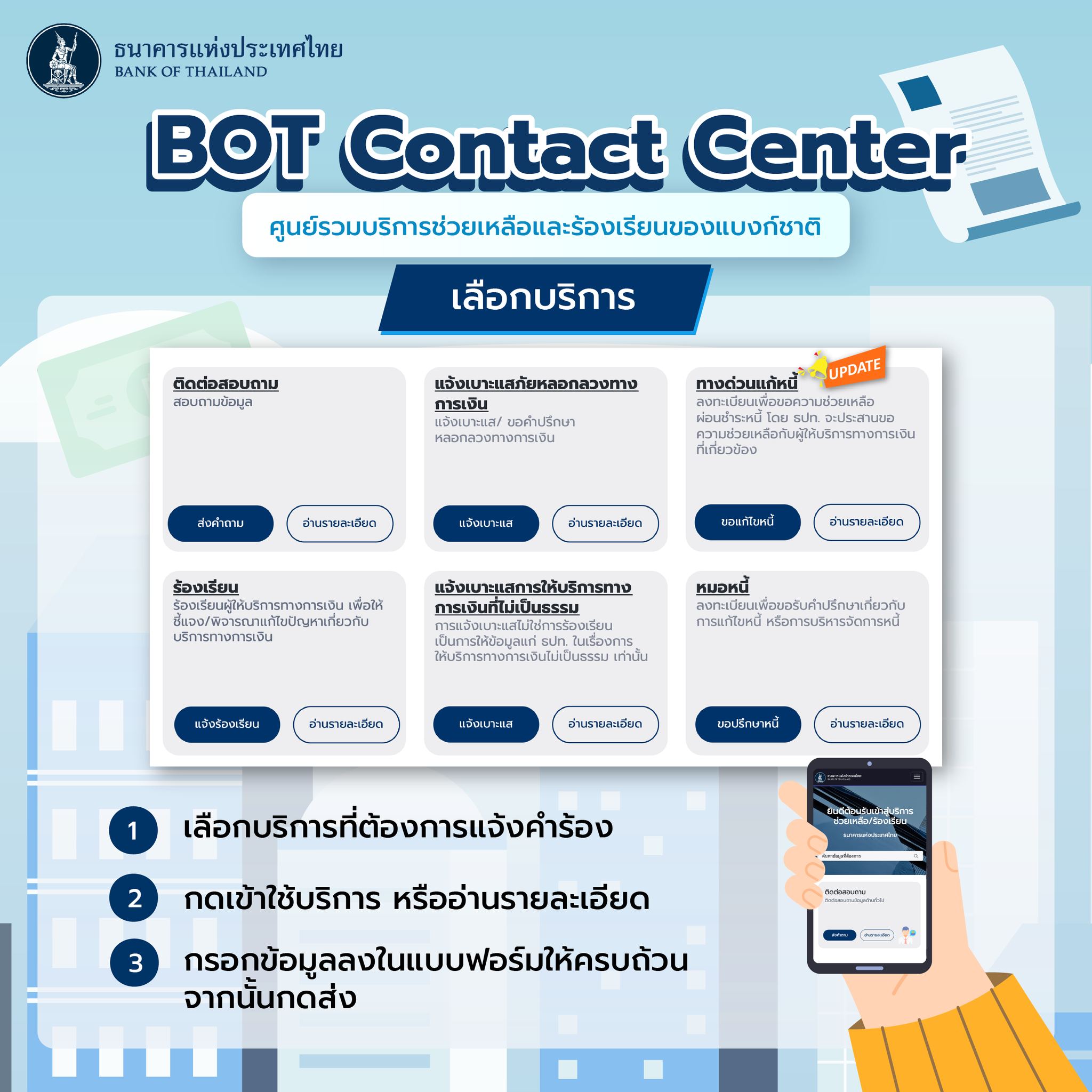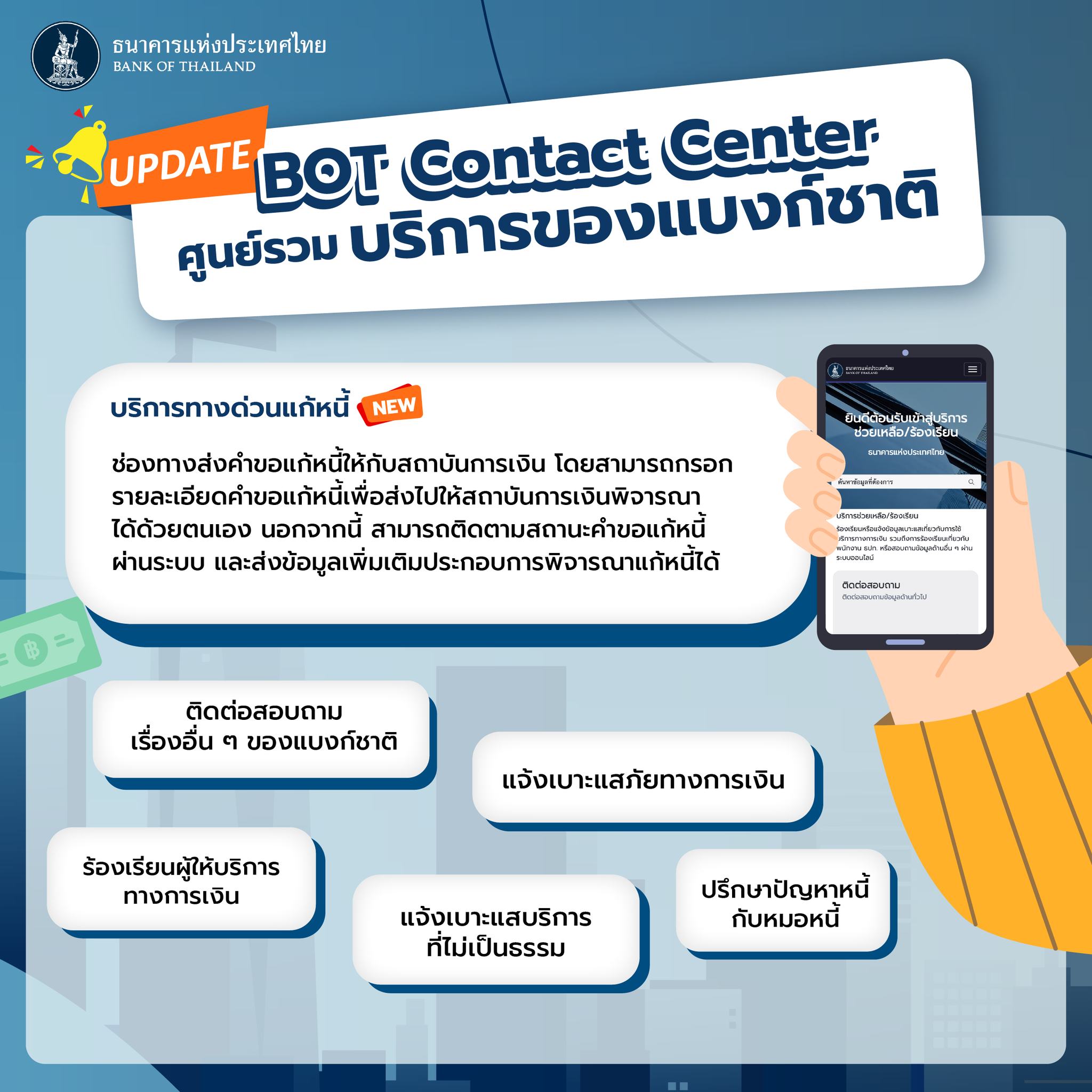 ธนาคารแห่งประเทศไทย อัพเดต BOT Contact Center ตั้งแต่วันที่ 14 พฤศจิกายน 2567 โดยเพิ่มบริการ ทางด่วนแก้หนี้ รวมถึงสามารถใช้ ThaiD เป็นอีกช่องทางในการสมัครได้ และบริการที่พร้อมให้คำปรึกษาและรับเรื่องร้องเรียน ดังนี้ ปรึกษาปัญหาหนี้กับหมอหนี้, แจ้งเบาะแสภัยการเงิน, ร้องเรียนผู้ให้บริการทางการเงิน, แจ้งเบาะแสบริการที่ไม่เป็นธรรม, ติดต่อสอบถามเรื่องอื่นๆ ของแบงก์ชาติ