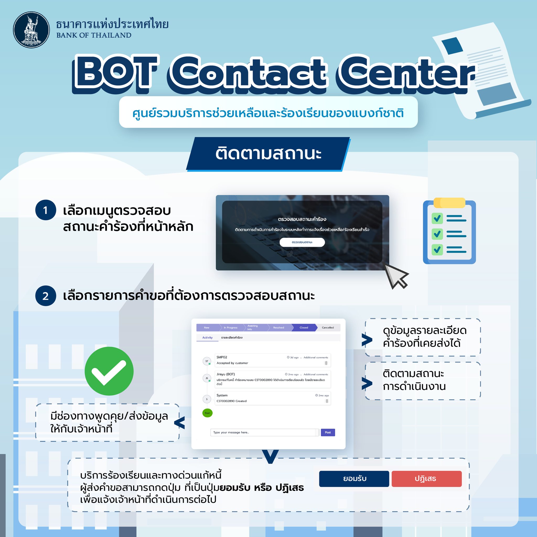 นอกจากนี้ BOT Contact Center ยังมีบริการที่พร้อมให้คำปรึกษาและรับเรื่องร้องเรียน ไม่ว่าจะเป็น