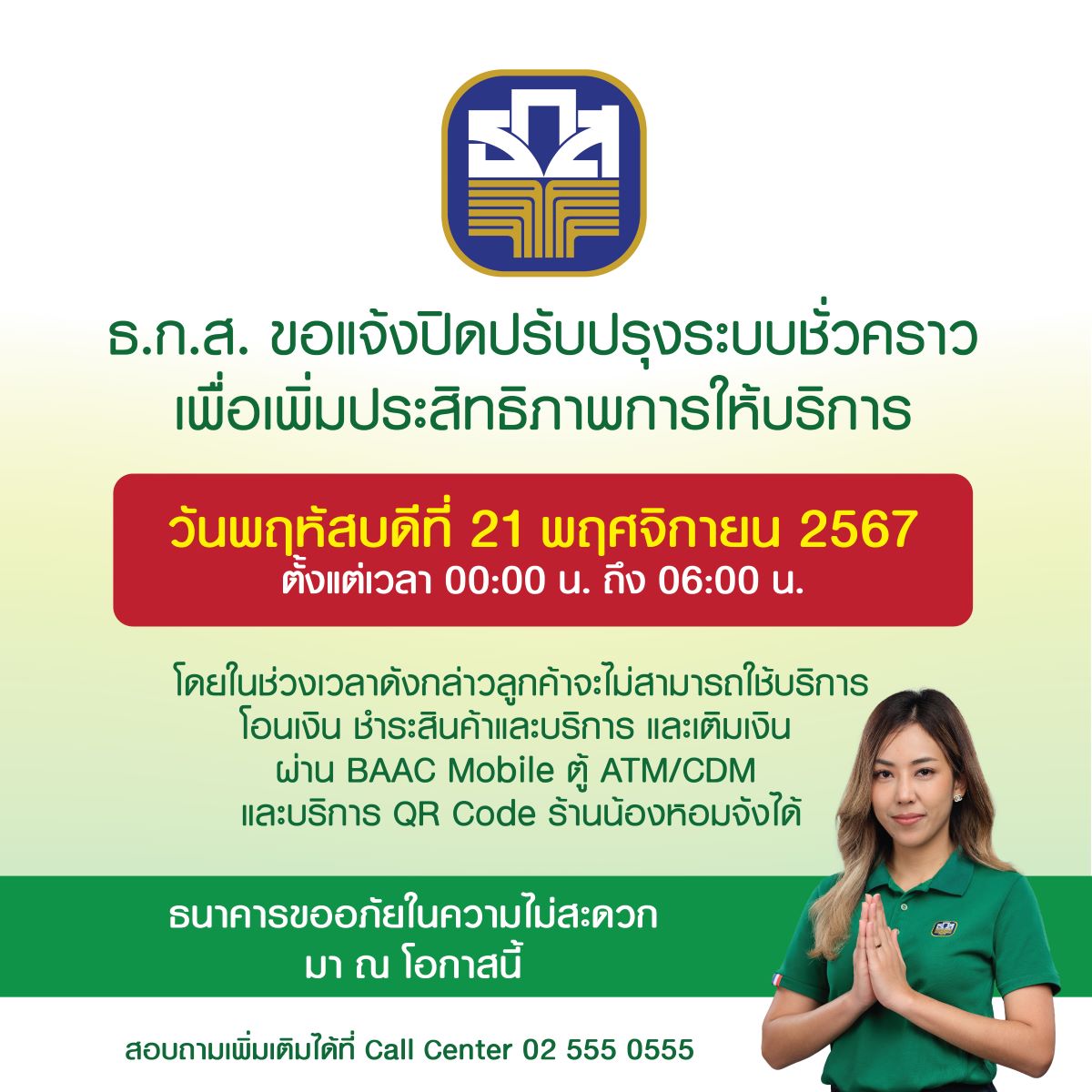 ธ.ก.ส. ขอแจ้งปิดปรับปรุงระบบชั่วคราว เพื่อเพิ่มประสิทธิภาพการให้บริการ วันที่ 21 พ.ย 67