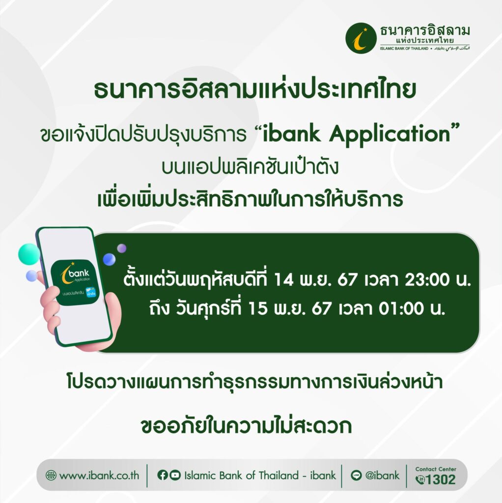 ธนาคารอิสลามแห่งประเทศไทย แจ้งปิดปรับปรุงบริการ ibank Application บนแอปพลิเคชันเป๋าตัง เพื่อเพิ่มประสิทธิภาพการให้บริการ ตั้งแต่ วันพฤหัสบดีที่ 14 พฤศจิกายน 2567 เวลา 23:00 น. – วันศุกร์ที่ 15 พฤศจิกายน 2567 เวลา 01:00 น.