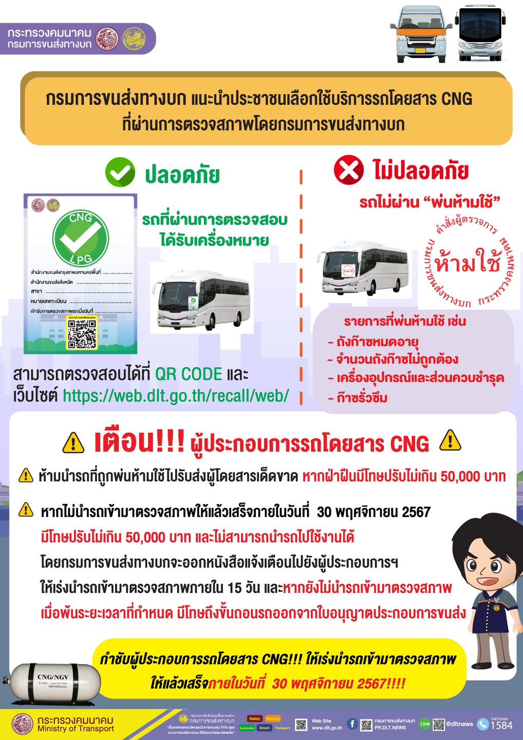กรมการขนส่งทางบก ดำเนินมาตรการในการควบคุมกิจการขนส่งทางบกอย่างเคร่งครัด สำหรับรถโดยสารสาธารณะ เตือนผู้ประกอบการรถโดยสาร CNG ต้องนำรถเข้ามาตรวจสภาพให้แล้วเสร็จภายในวันที่ 30 พฤศจิกายน 2567 หากไม่นำมารถมาตรวจสภาพจะไม่สามารถนำรถไปใช้งานได้ โดยกรมการขนส่งทางบกจะออกหนังสือแจ้งเตือนไปยังผู้ประกอบการฯให้เร่งนำรถเข้ามาตรวจสภาพภายใน 15 วัน หากยังฝ่าฝืนมีโทษถึงขั้นถอนรถออกจากใบอนุญาตประกอบการขนส่ง พร้อมแนะนำประชาชนตรวจสอบรถโดยสาร CNG ที่ผ่านการตรวจสภาพได้ที่เว็บไซต์ https://web.dlt.go.th/recall/web/ หรือสแกนผ่าน QR Code ที่สติ๊กเกอร์ผ่านการตรวจสภาพที่หน้ารถโดยสาร