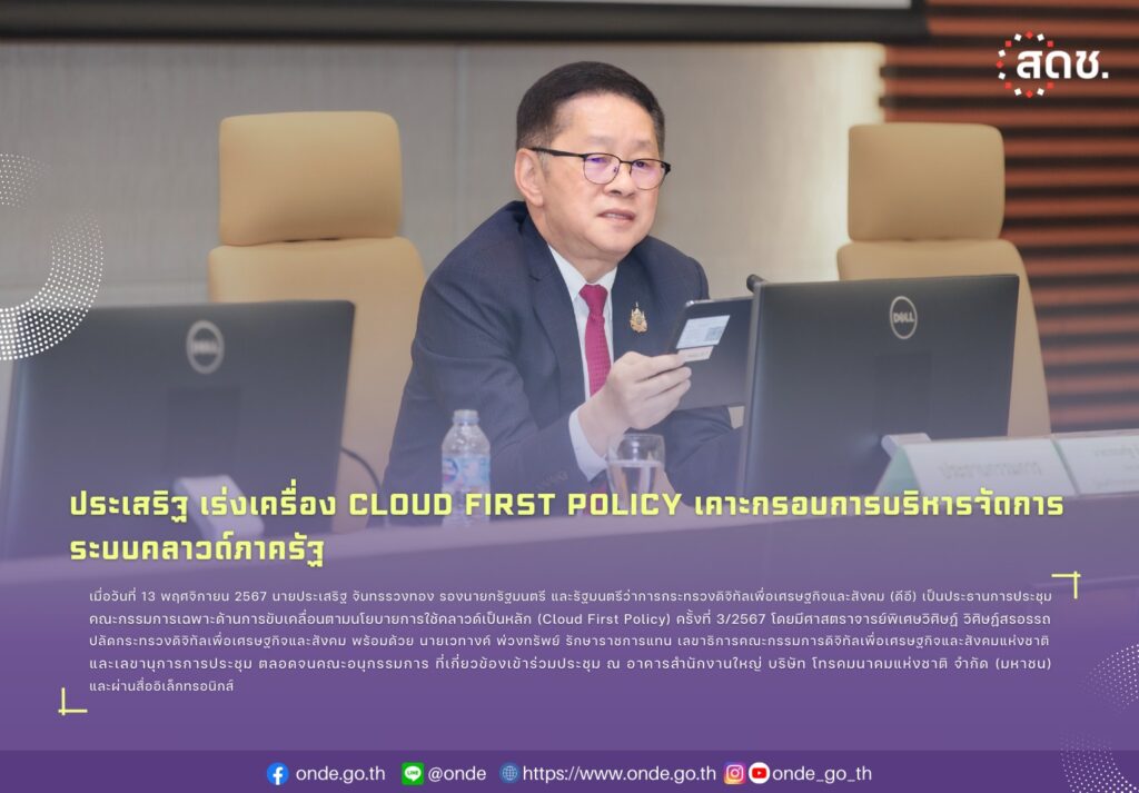 เมื่อวันที่ 13 พฤศจิกายน 2567 นายประเสริฐ จันทรรวงทอง รองนายกรัฐมนตรี และรัฐมนตรีว่าการกระทรวงดิจิทัลเพื่อเศรษฐกิจและสังคม (ดีอี) เป็นประธานการประชุมคณะกรรมการเฉพาะด้านการขับเคลื่อนตามนโยบายการใช้คลาวด์เป็นหลัก (Cloud First Policy) ครั้งที่ 3/2567 โดยมีศาสตราจารย์พิเศษวิศิษฏ์ วิศิษฏ์สรอรรถ ปลัดกระทรวงดิจิทัลเพื่อเศรษฐกิจและสังคม พร้อมด้วย นายเวทางค์ พ่วงทรัพย์ รักษาราชการแทน เลขาธิการคณะกรรมการดิจิทัลเพื่อเศรษฐกิจและสังคมแห่งชาติ และเลขานุการการประชุม ตลอดจนคณะอนุกรรมการ ที่เกี่ยวข้องเข้าร่วมประชุม ณ ห้องประชุม 801 ชั้น 8 อาคารสำนักงานใหญ่ บริษัท โทรคมนาคมแห่งชาติ จำกัด (มหาชน) และผ่านสื่ออิเล็กทรอนิกส์